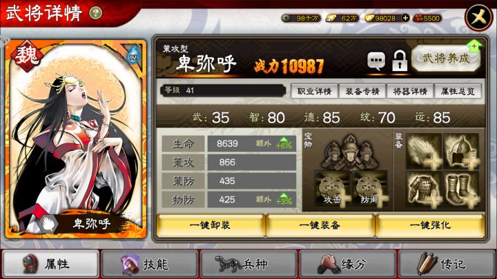 大家好 我是三国百晓生,在后续的攻略中,我将会给大家带来三国志详细的武将介绍。今天我们先来看看三国名将——卑弥呼先来看看卑弥呼的整体属性界面:可以看到卑弥呼整体属性中以德和运最高 达到85 三国武将:卑弥呼武:35智:80德:85统:70运:85计略:天照神光搭配兵种:谋士 特技:魅惑 兵种搭配: 缘分以及宝物搭配: 主要搭配:曹丕 左慈宝物搭配:孙子兵法 玄冰玉鼎