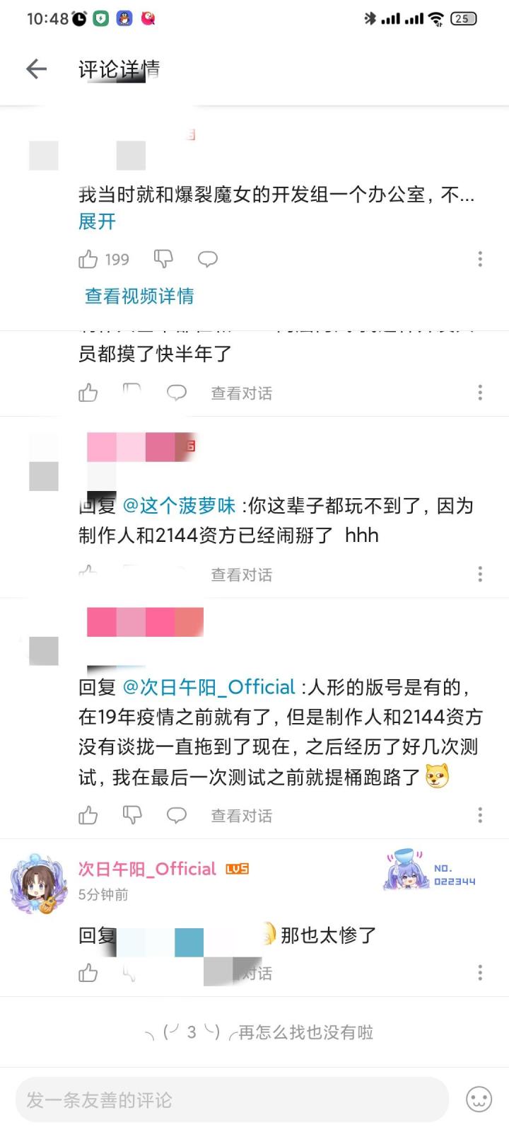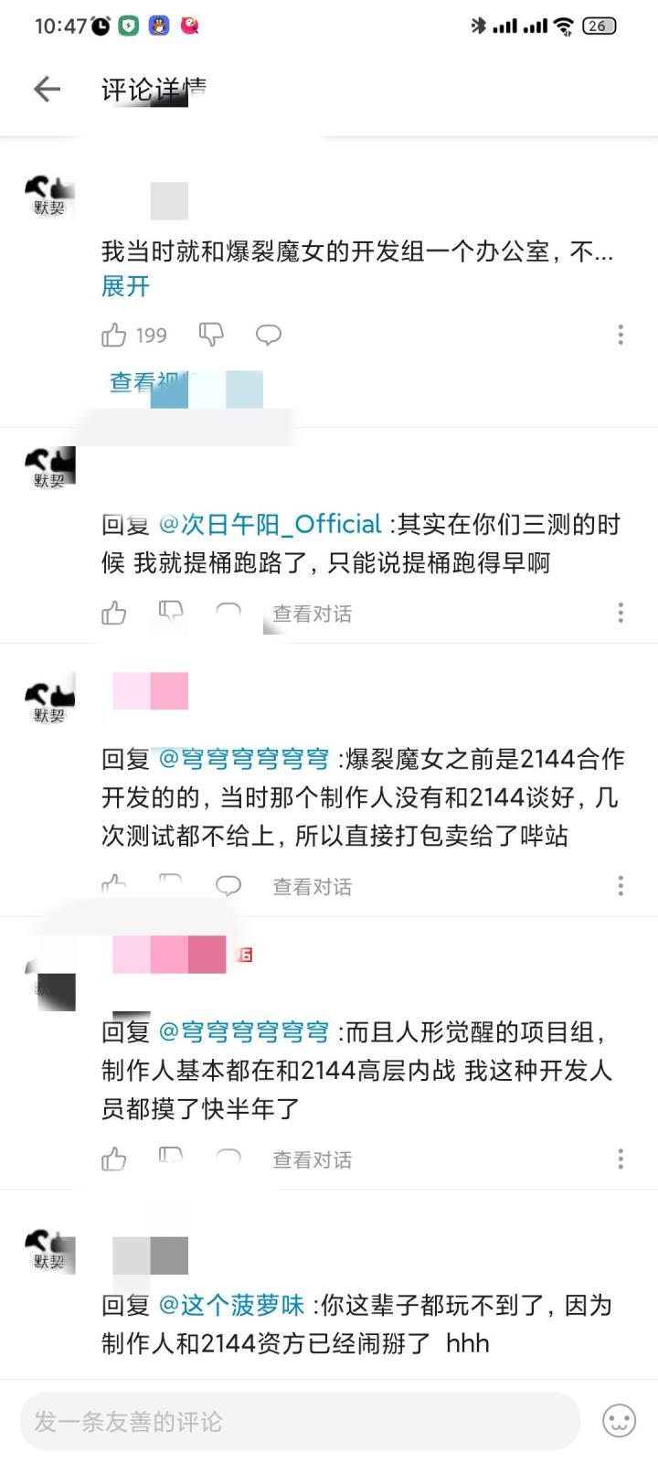 今天tap上看到的,有自称是人形特效师的人发言,称人形早已完成制作,之所以长时间不公测,是因为制作人与2144方面的谈判陷入僵局。此人还透露,爆裂魔女当初也经历了类似的事件,因为与2144之间异议过大难以弥合,才促成了爆裂打包卖给b站的结果。此消息不知真伪,我们仍在观望。