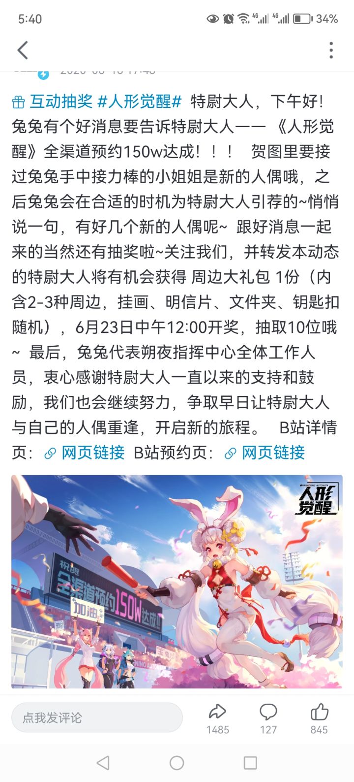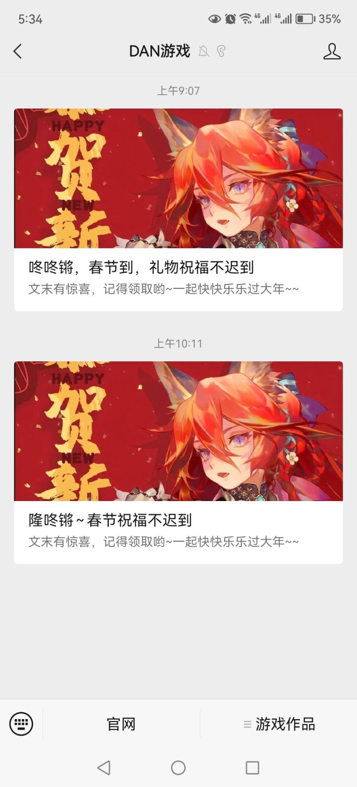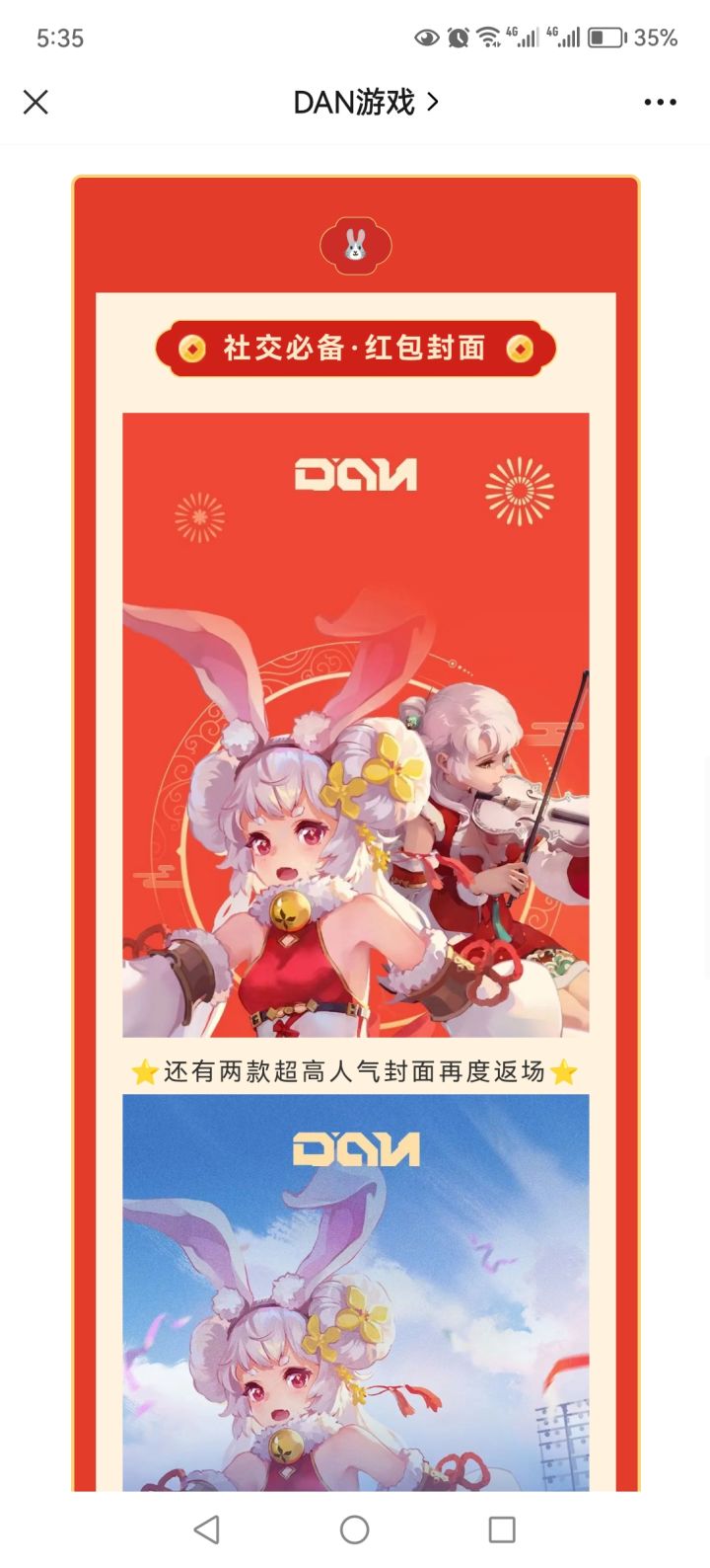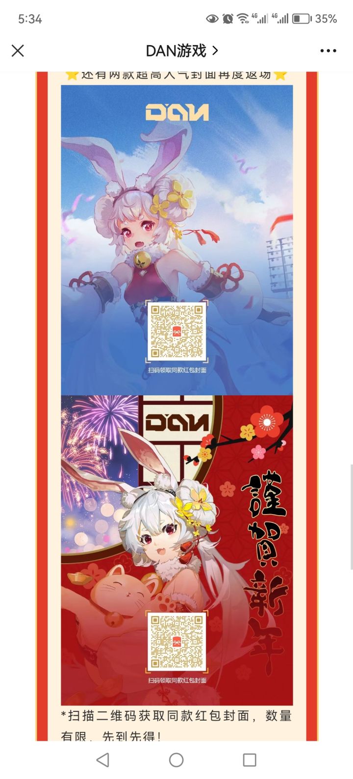 活了活了,公司公众号发消息了如果有可能的话,各位能不能@一下官方,至少回个话,不要求给出公测时间,就求回个话。DAN的官方公众号发了春节消息,看样子公司员工福利还不错(至少证明员工没跑光)。红包封面是玉兔,两张玉兔的立绘分别来自20年春节和全平台预约150万,另外还有两张新立绘,一个是狐耳,一个拉提琴(和艾妮莎人设撞了啊)。狐耳角色是新的,不是宇迦也不是迦具土,能看出遵循了人形一贯的风格,人体