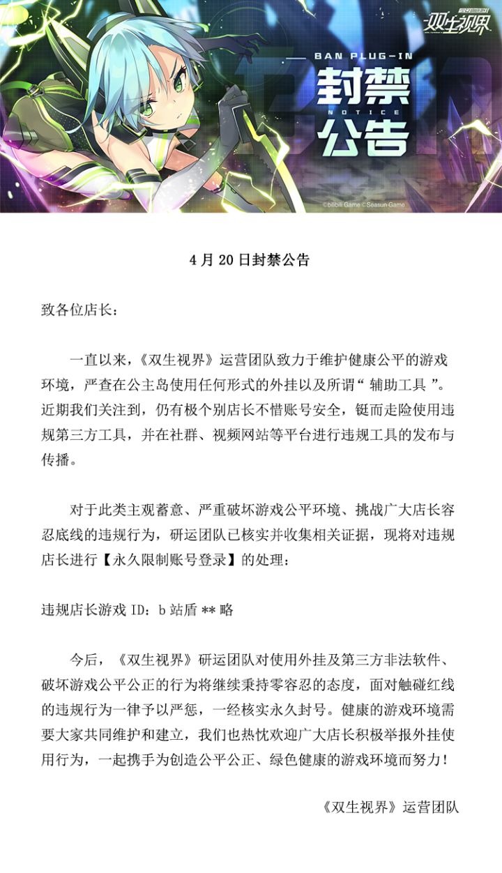 【双生视界】4月20日封禁公告