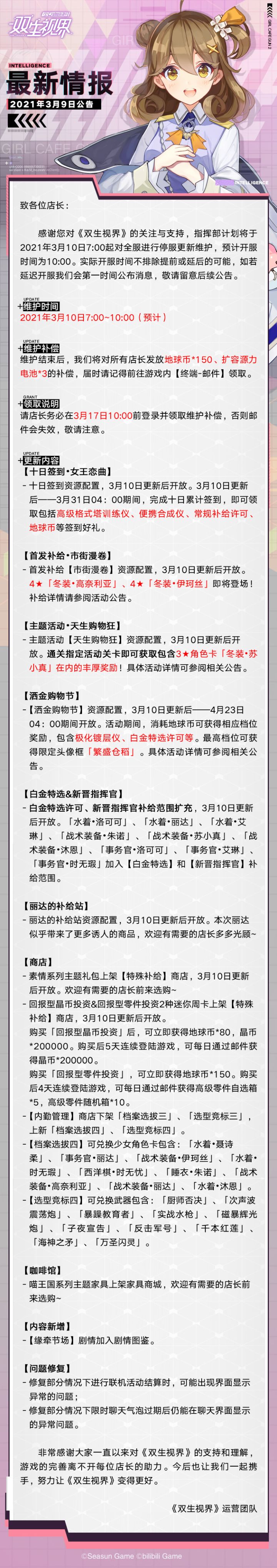 致各位店长:我们将于3月10日7:00对全区服进行停服维护,并通过在线更新方式进行游戏更新,预计开服时间为10:00。在维护期间,您将暂时无法进行游戏,请提前合理安排游戏时间。详细公告内容请点击下方图片查看。