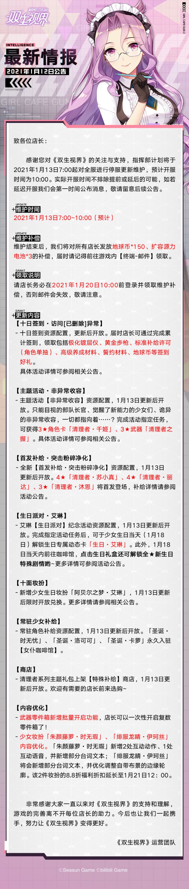 致各位店长:我们将于1月13日7:00对全区服进行停服维护,并通过在线更新方式进行游戏更新,预计开服时间为10:00。在维护期间,您将暂时无法进行游戏,请提前合理安排游戏时间。详细公告内容请点击下方图片查看。
