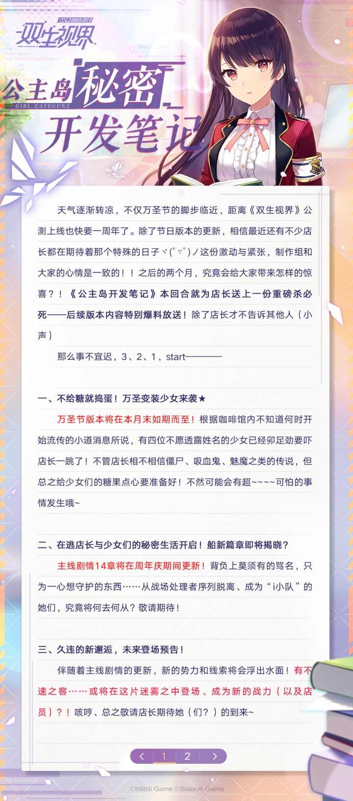天气转凉,万圣节的脚步临近,且距离公测上线也快要一周年了,店长们都在期待后续游戏内容了吧。《公主岛秘密开发笔记》(十月刊)本回合为店长送上了一份重磅杀必死——后续版本内容特别爆料放送!敬请点击下方图片查看~再次感谢店长对《双生视界》的热爱与支持✧⁺⸜(●˙▾˙●)⸝⁺✧