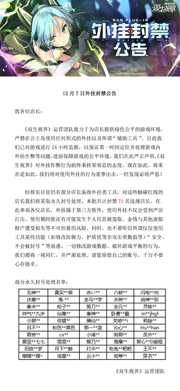 致各位店长:《双生视界》运营团队致力于为所有店长提供绿色公平的游戏环境,严禁在公主岛使用任何形式的外挂以及“辅助工具”。目前我们发现仍有玩家染指外挂类工具,这些玩家篡改游戏数据,破坏游戏平衡。我们将对触碰红线的玩家采取永久封号处理,本批共计封禁72名(为保护个人隐私,将对玩家昵称进行隐藏处理)。对账号封禁有疑问的玩家,请联系客服进行查询和申诉↓客服QQ公众号:800864530客服邮箱