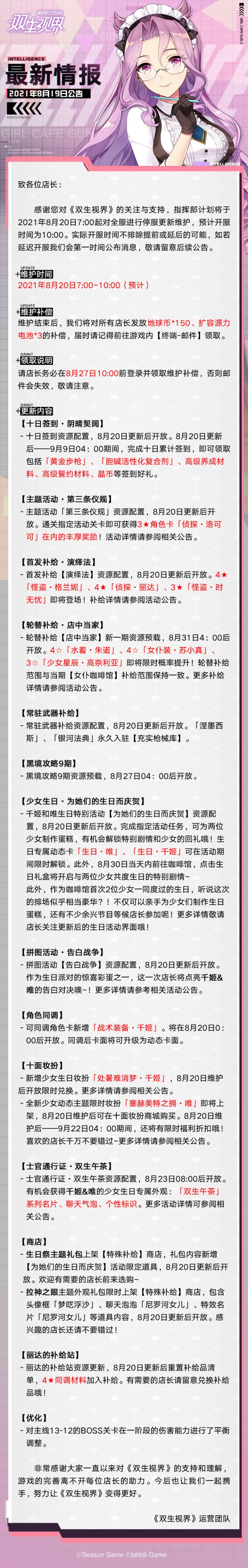 致各位店长:我们将于8月20日7:00对全区服进行停服维护,并通过在线更新方式进行游戏更新,预计开服时间为10:00。在维护期间,您将暂时无法进行游戏,请提前合理安排游戏时间。详细公告内容请点击下方图片查看。