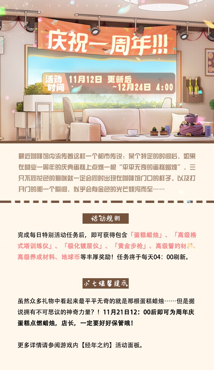 店长,1周年营业快乐!一直以来,感谢店长的支持和陪伴!回忆过无数美好、向她传达了最真挚的话语,终于到了这一刻。最后,小七将在这里为大家揭晓:1周年庆典活动特别情报•最终弹——【1周年庆典活动版本完全指南】!和你的崭新心跳奇遇,这才刚刚开始!!1周年庆典分为上、下两期进行,上半期「周年庆•梦启」将于11月19日更新后开放,下半期「周年庆•星绽」将于12月8日更新后开放。参与上下期庆典活动