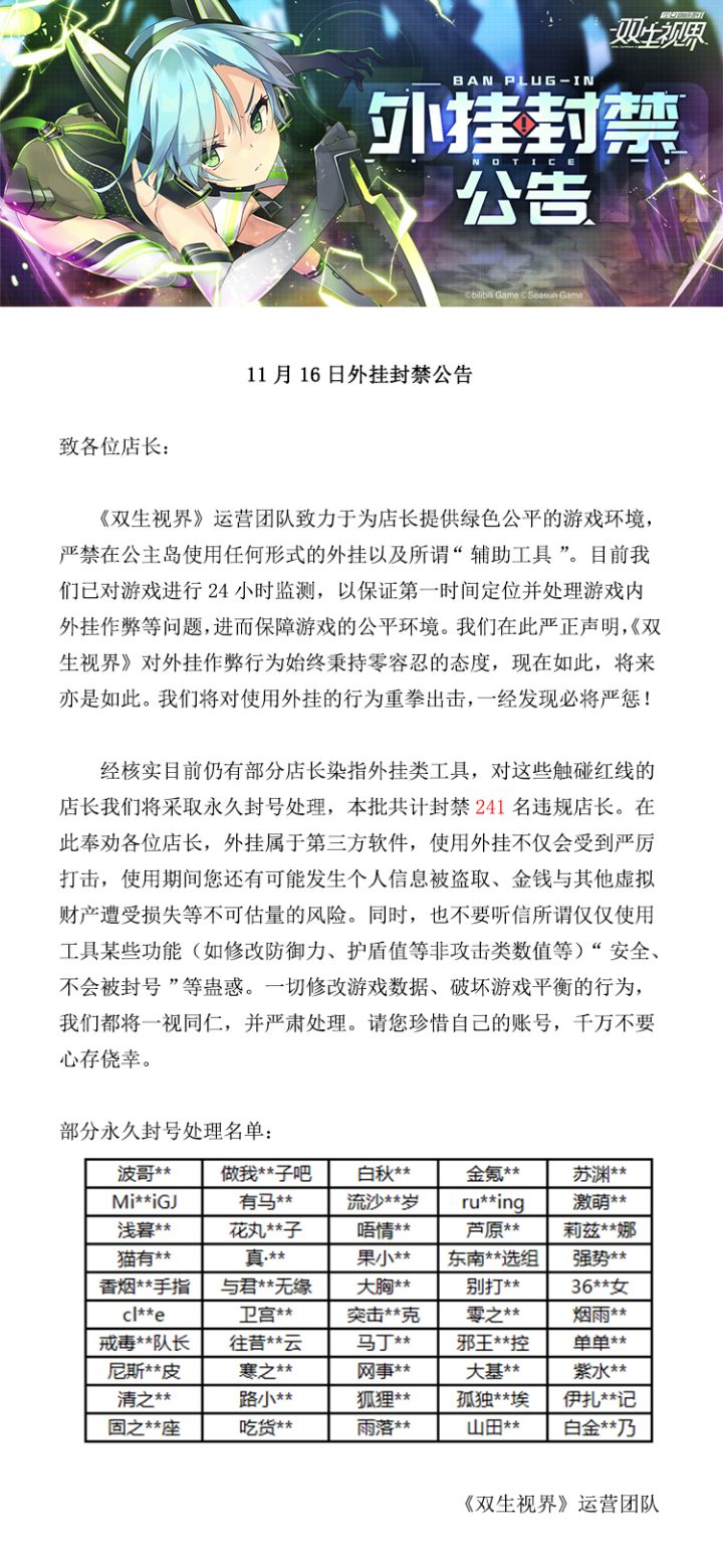 致各位店长:《双生视界》运营团队致力于为所有店长提供绿色公平的游戏环境,严禁在公主岛使用任何形式的外挂以及“辅助工具”。目前我们发现仍有玩家染指外挂类工具,这些玩家篡改游戏数据,破坏游戏平衡。我们将对触碰红线的玩家采取永久封号处理,本批共计封禁241名(为保护个人隐私,将对玩家昵称进行隐藏处理)。对账号封禁有疑问的玩家,请联系客服进行查询和申诉↓客服QQ公众号:800864530客服邮