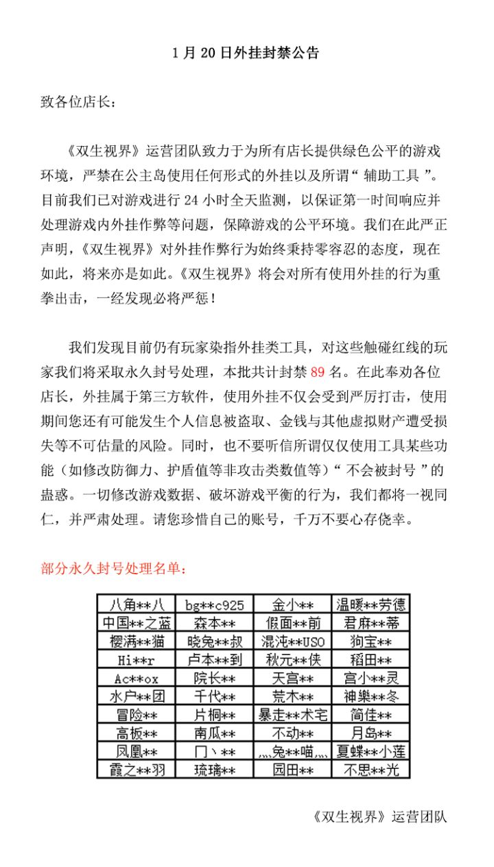致各位店长:《双生视界》运营团队致力于为所有店长提供绿色公平的游戏环境,严禁在公主岛使用任何形式的外挂以及“辅助工具”。目前我们发现仍有玩家染指外挂类工具,这些玩家篡改游戏数据,破坏游戏平衡。对此我们将对触碰红线的玩家采取永久封号处理,本批共计封禁89名(为保护个人隐私,将对玩家昵称进行隐藏处理)。对账号封禁有疑问的玩家,请联系客服进行查询和申诉↓客服QQ公众号:800864530客服邮