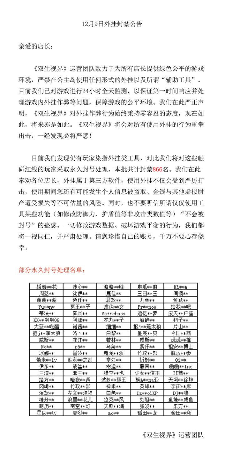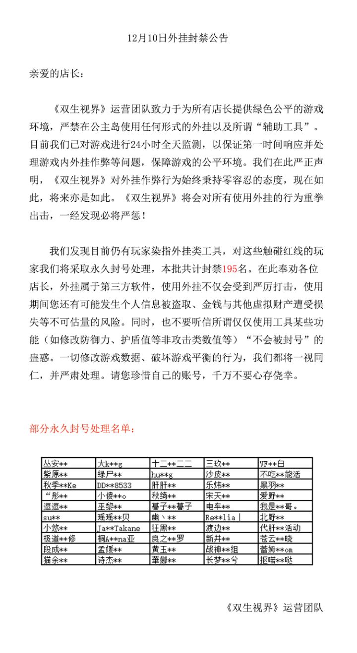 亲爱的店长:《双生视界》运营团队致力于为所有店长提供绿色公平的游戏环境,严禁在公主岛使用任何形式的外挂以及“辅助工具”。目前我们发现有玩家染指外挂类工具,这些玩家篡改游戏数据,破坏游戏平衡。对此我们将对触碰红线的玩家采取永久封号处理,本批共计封禁866名(为保护个人隐私,将对玩家昵称进行隐藏处理)。对账号封禁有疑问的玩家,请联系客服进行查询和申诉↓客服QQ公众号:800864530客服邮
