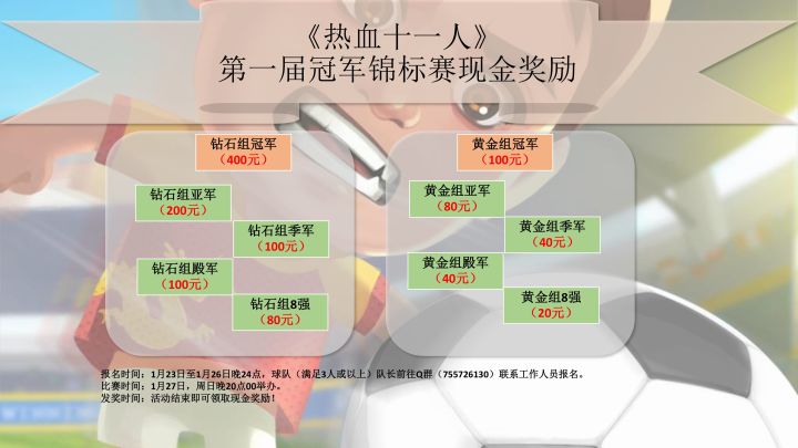 一,活动时间:1月23日-1月27日二,报名阶段:1月21日至1月26日,即周一到周六晚24点前由队长联系官方Q群(755726130)工作人员报名参赛,球队满足三人及以上球员即可报名参加。三、海选阶段:1月23日至1月26日,即周三至周六通过【锦标赛】内累计积分,取综合积分前16支球队参加第一届冠军锦标赛。积分规则:每日锦标赛获得8强(计40积分),4强(计60积分),亚军(计80积分