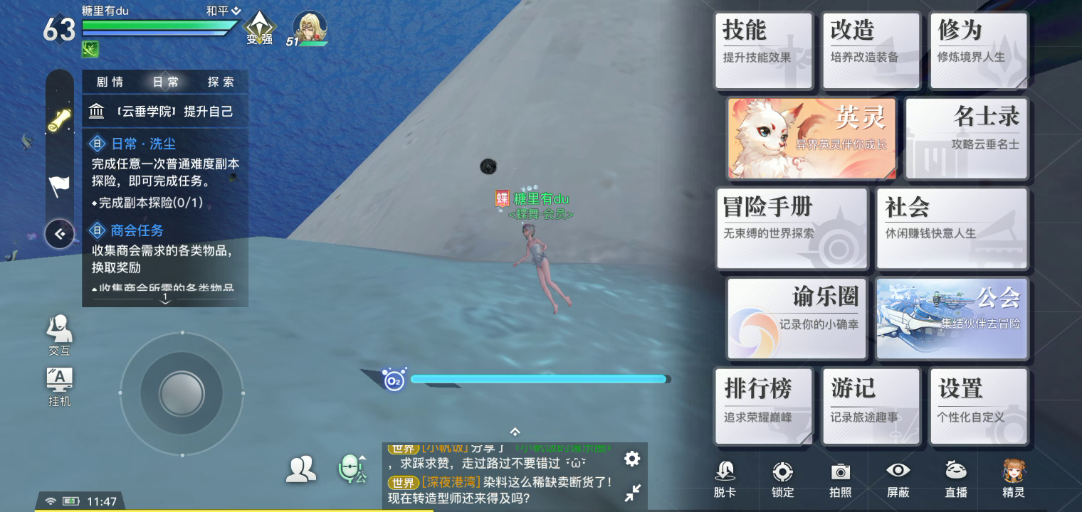 海里死了一次,给了一个什么“水域主”好像,然后继续玩,在水里咽不了气了好像。。卡在这里,游不动,点坐标.点回到公会,都是该地点无法传送,脱卡也没用🐸