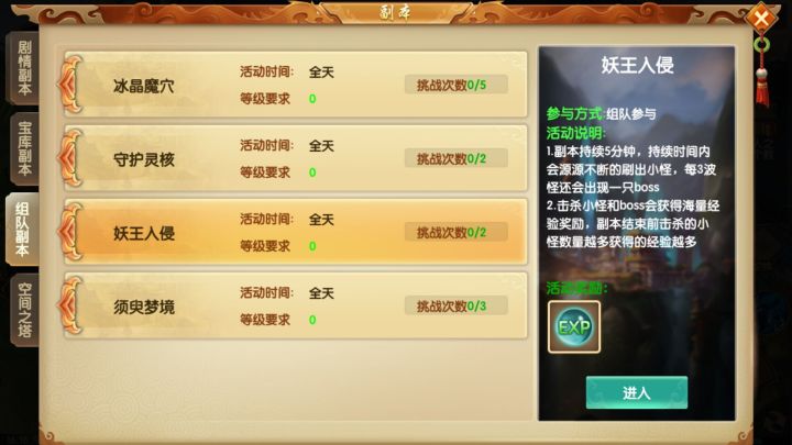 【妖王入侵】妖王入侵参与方式:组队参与活动说明:1、副本持续5分钟,持续时间内会源源不断的刷出小怪,每3波怪还会出现一只boss2、击杀小怪和boss会获得海量经验奖励,副本结束前击杀的小怪越多获得的经验越多获得奖励:海量经验进入副本后需尽可能多的击杀小怪和boss,伤害越高,击杀的小怪越多,经验也就越多副本持续五分钟,无限制波数,持续时间内能打多少波就多少波,时间结束后将自动退出