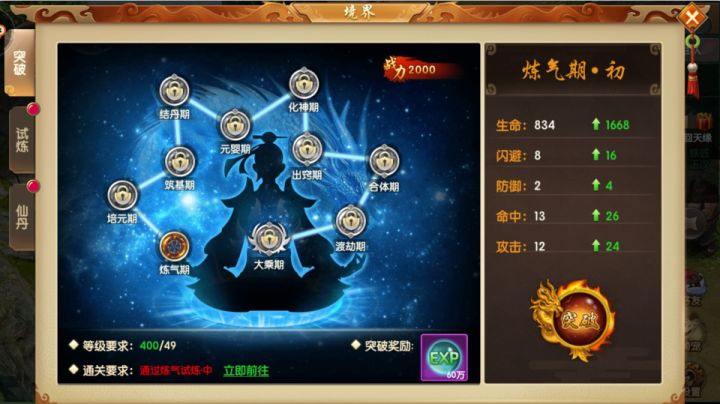 【境界系统】一、境界介绍角色在游戏中,可以从一名普通的修道者,从培元期逐渐修炼至仙境。目前游戏中已经开放了28层修炼境界:炼气初期、炼气中期、炼气后期;培元初期、培元中期、培元后期;筑基初期、筑基中期、筑基后期;结丹初期、结丹中期、结丹后期;元婴初期、元婴中期、元婴后期;化神初期、化神中期、化神后期;出窍初期、出窍中期、出窍后期;合体初期、合体中期、合体后期;渡劫初期、渡劫