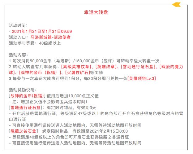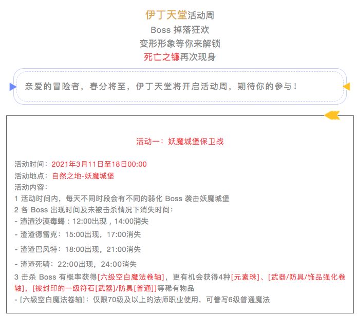 亲爱的冒险者,为庆祝新春佳节,伊丁大陆上开启一系列的庆典活动,期待你的参与!活动一:新春猜灯谜活动时间:2021年2月11日10:00至27日09:59活动购买入口:牛气冲天[新春使者]——马洛斯(32844,33566)活动入口:牛哞哞[灯谜使者] (指定城鎮安全区内)活动内容:1 获得[贺年烟花],获取途径如下:– 找牛气冲天[新春使者]以20,000金币/个购买,每日限够5个–