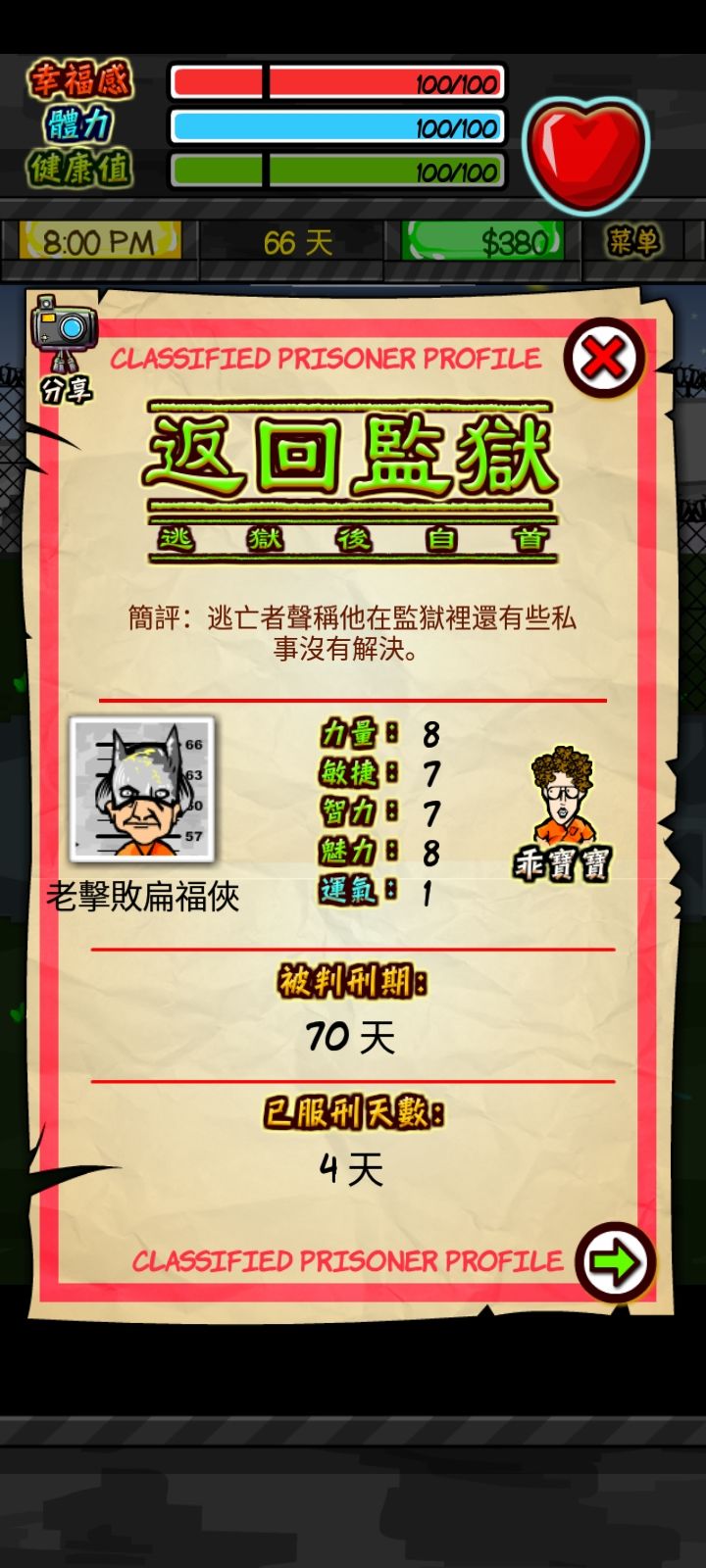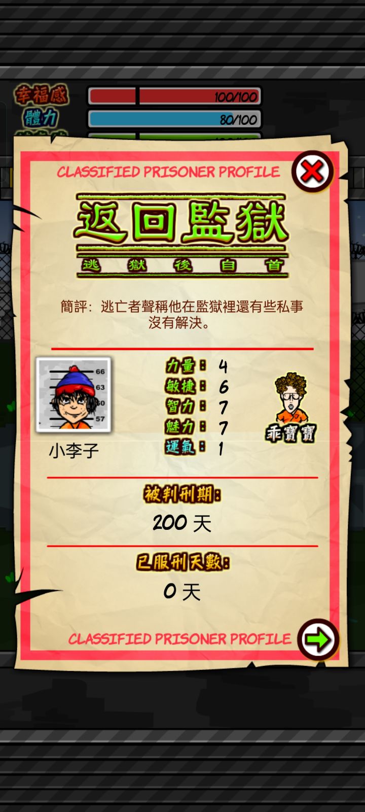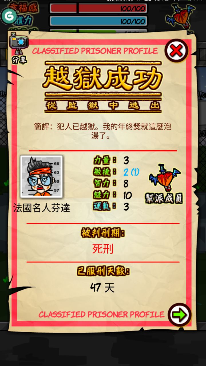 这个角色通关的技巧也可以用“广积粮,缓称王”来解释,还有就是每天打电话给黑社会聊天关系满的快每次满了给200块,有钱了立马用掉后期强大了才不用太小心,劫持监狱长果然是最快的出逃方法,换房到单人房,学会银行家技能去监狱长办公室,记得带把200块的刀子然后劫持出逃,别忘了提前打电话给黑社会老大让他派辆车价格800块加关系满值
