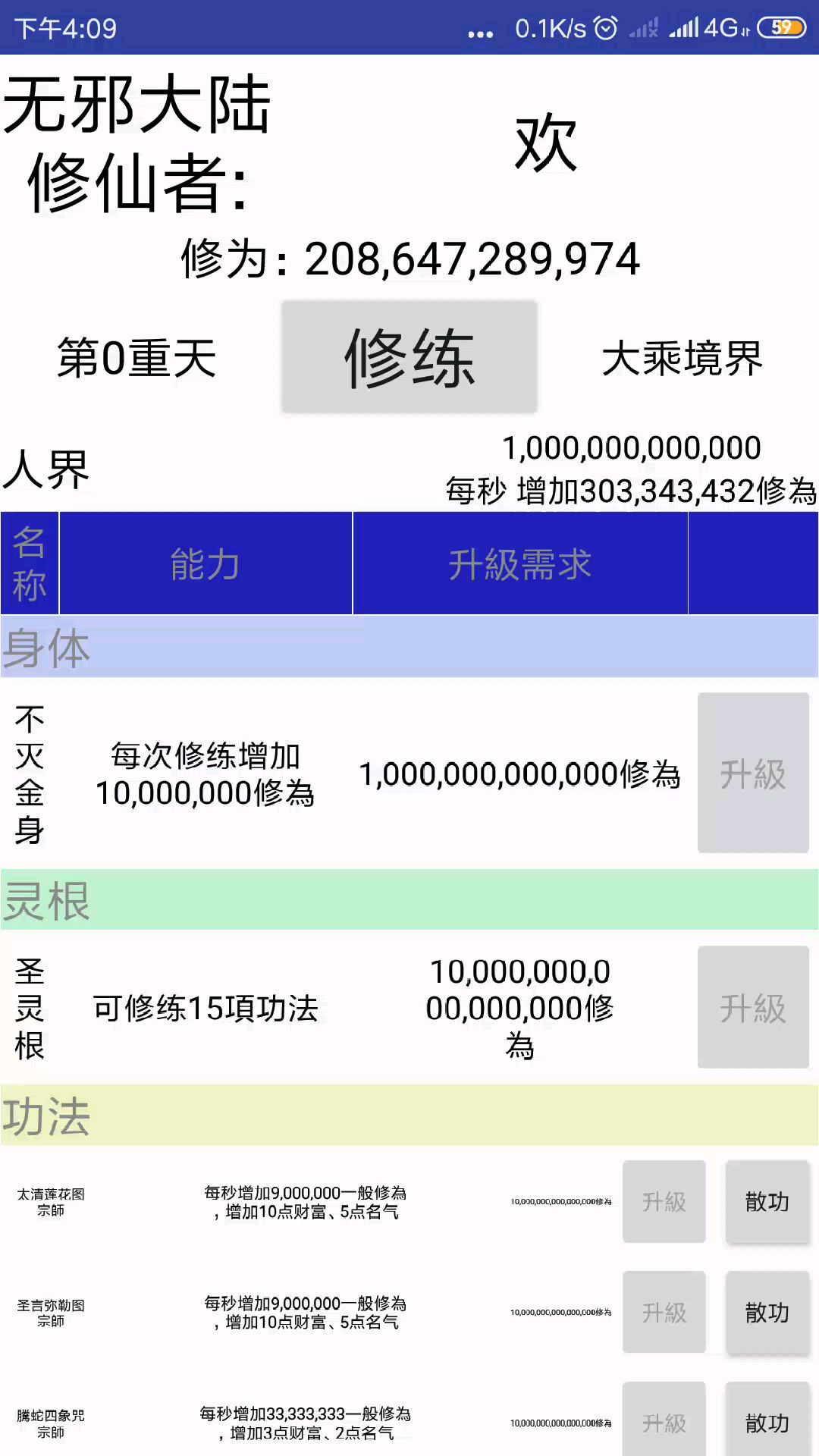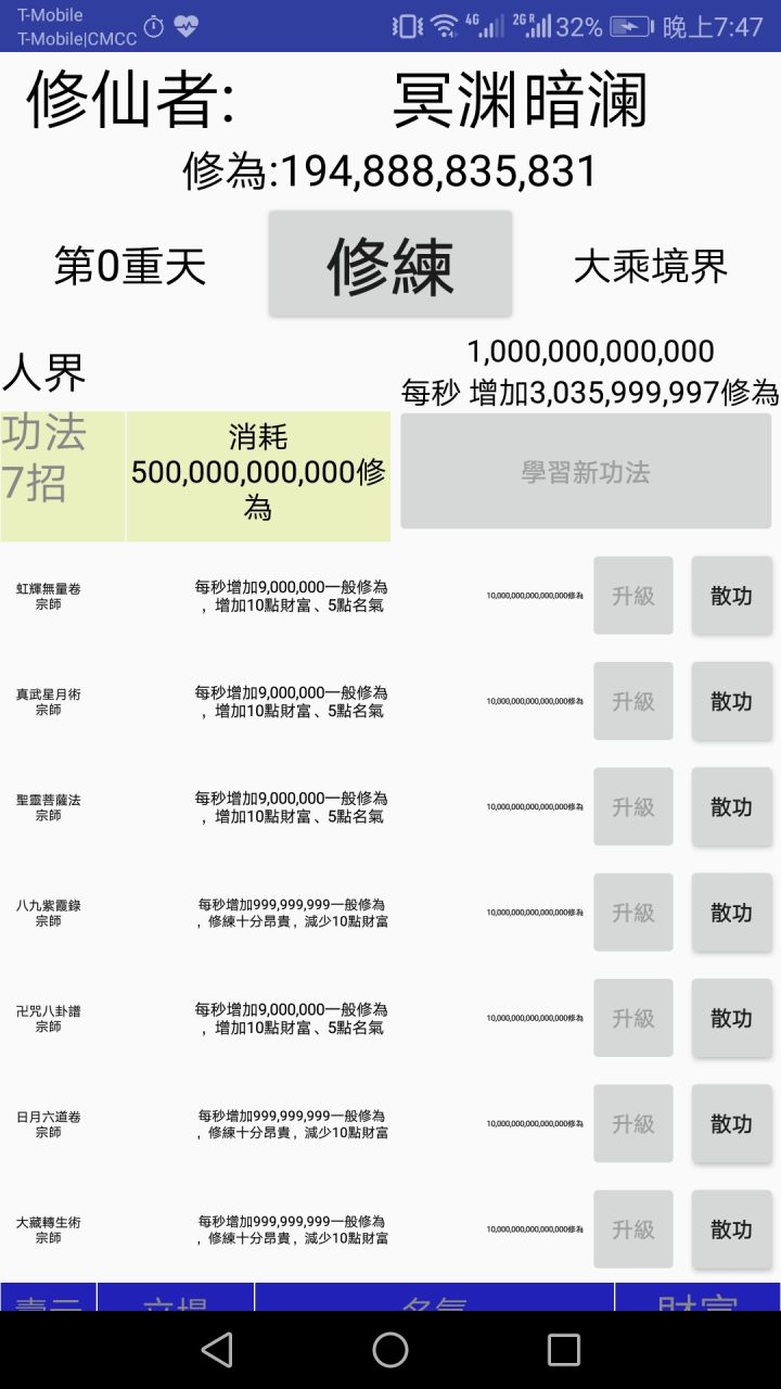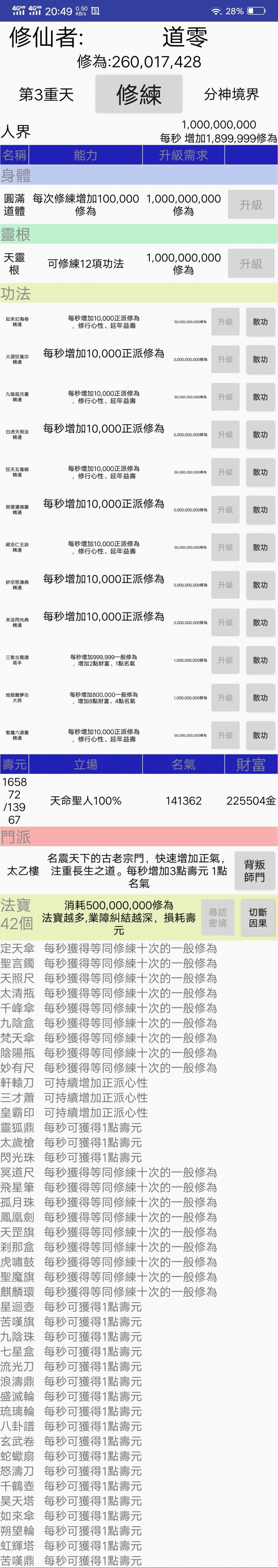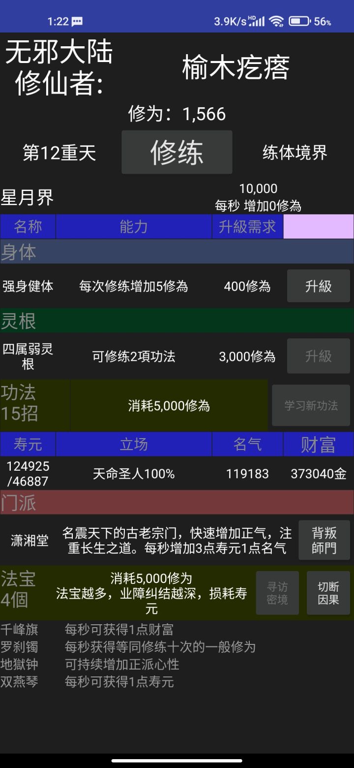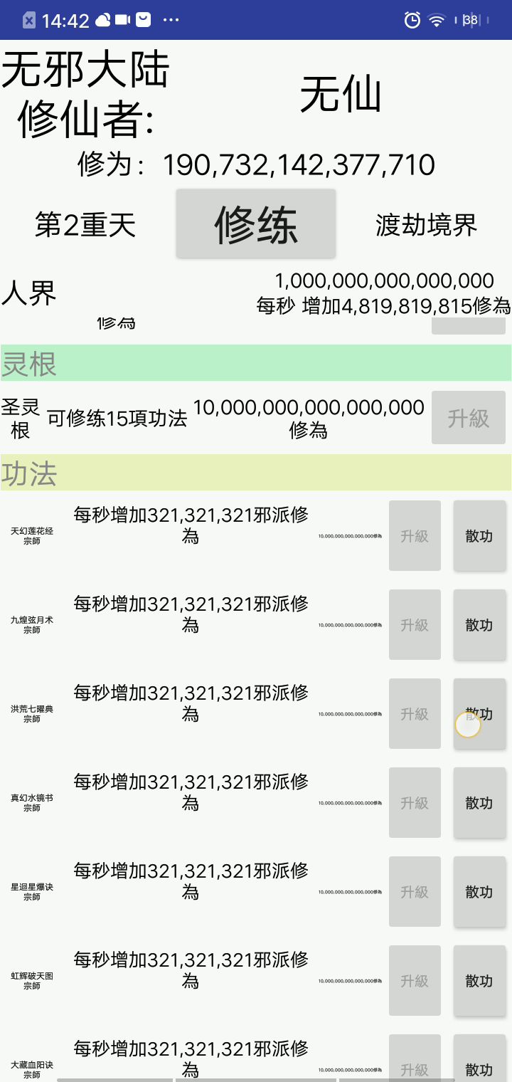 通关了。。。。通关原来是重置 (寿元不变罢了)玩了3个小时 分享下通关心动 想重置的玩家可以试试先刷到加入增加财富+10的门派 然后法宝+1寿元然后刷普通修为的功法后期会分为两种 一种+财富一种修为超高-财富 每一个+财富搭配一个-财富(遗忘功法需要130金)最后两个修邪功
