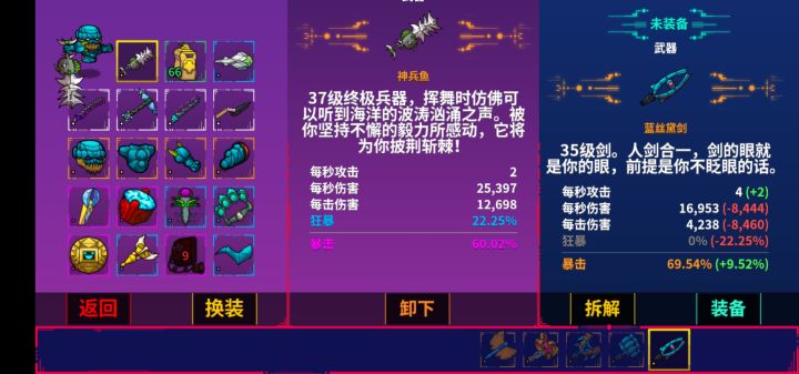 之前玩过一次,感觉特别好玩,在巴格沃有个任务卡住了,就删了,暑假有下回来了,陆陆续续完了两个月终于通关了,除了一个神兵鱼的任务没完成,打最终Boss的时候打了四五次才打掉,状态拉满才过的,这里可以给你们分享个小技巧,也是从论坛大佬发的贴子看到的刚制作好装备,点开发现装备属性不好可以直接大返回到手机后台清理,然后重新进游戏就可以在开一次装备属性。装备的话各人感觉那个黄色的有蓝色笑脸的像个盾牌一样