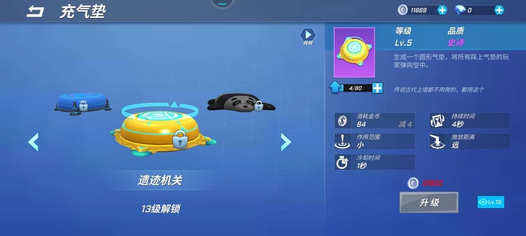 充气垫解析 逃跑吧少年充气垫这个道具是小布比较常用的道具卡,不管是自己被困禁闭室还是队友被困禁闭室被救之后都可以通过充气垫逃生。这个道具达到黄金段位后通过开启宝箱获得该道具卡即可在道具卡中解锁!品质:史诗类型:放置物持续时间:四秒,较短 介绍:充气垫是两个阵营都可以使用的,使用时生成圆形气垫,可以将将所有踩气垫的玩家弹起又高又远。金币消耗:每次消耗金币100,但是金币消耗会随着我们道具升级而减少。