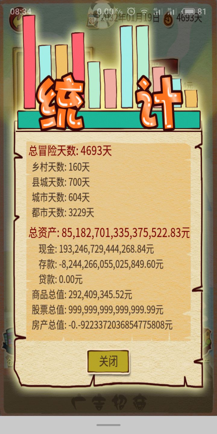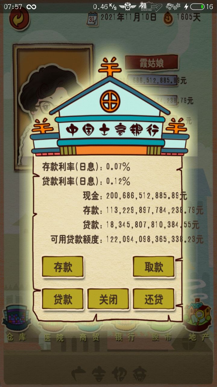 肛了整整两天,感觉自己通关了,个人意见,炒股很赚钱多投入多汇报,不会就算了,记得多刷天数[发不了图片,可能bug吧,口头汇报一下,银行存款,7000多亿,每天地产会给我7千万,股票价值大概1万个亿,可贷款金额,一万亿,哈哈哈]