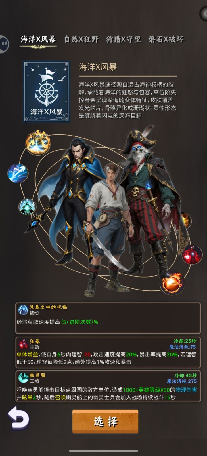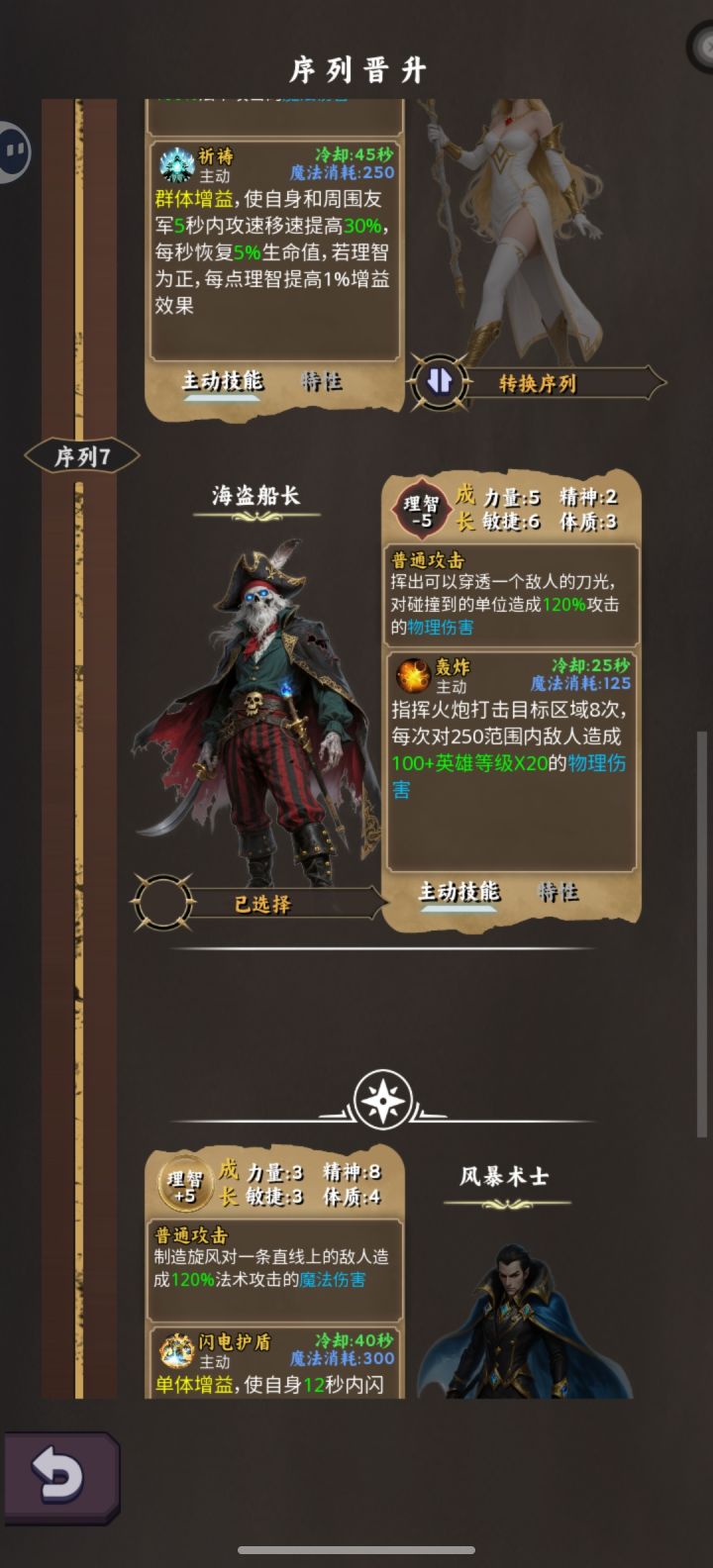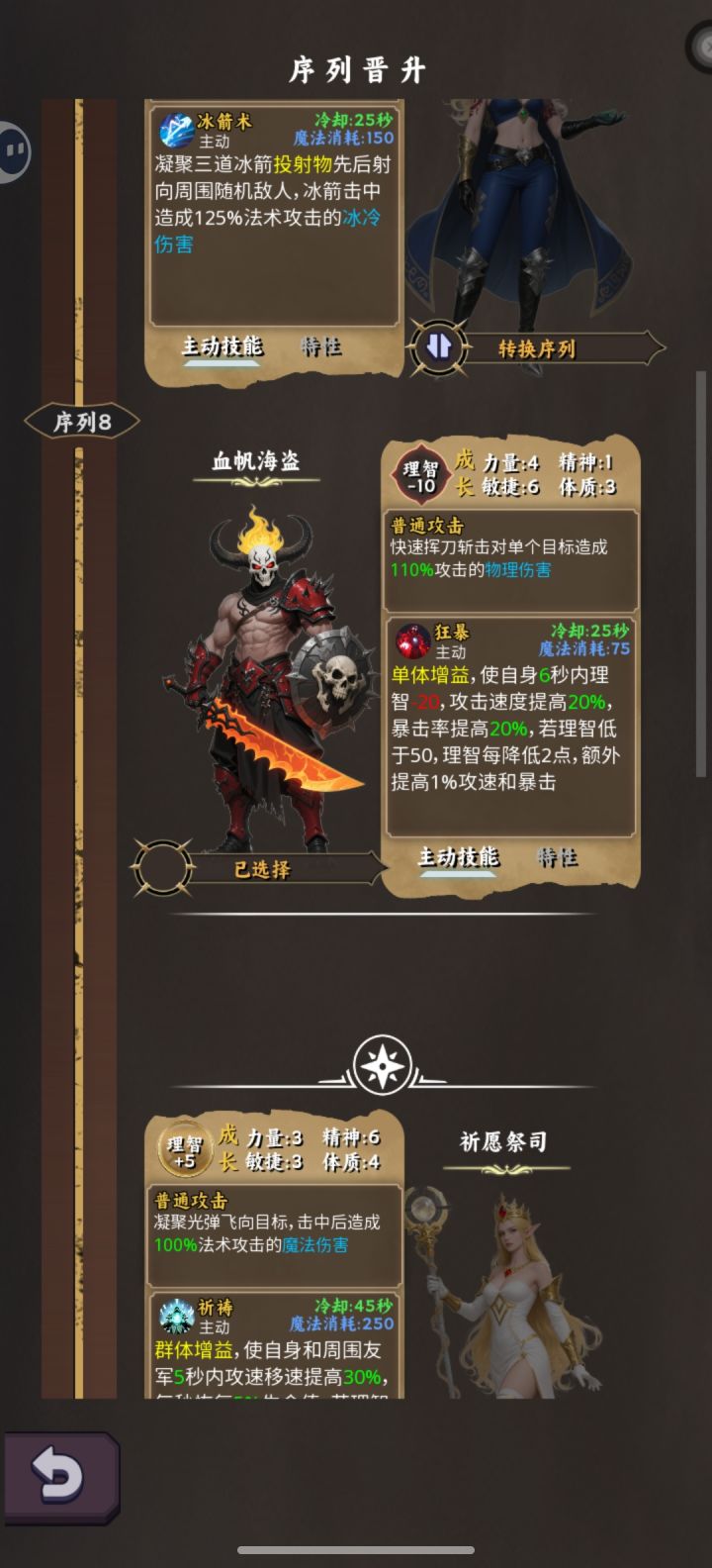 走海盗路线比较轻松舒适,难度不算太大,适合新手,反正是个挂机游戏,慢慢来开局扔火瓶到10级,迎来第一次序列晋升,选择血帆海盗,被动提供基础暴击率和爆伤,主动技能提供增益buff,短暂提高攻速暴击率,理智越低效果越强。天赋方面优先选择左侧力量增强和最终伤害,然后力挽狂澜,有需要的也可以把力量增强下边的技能点出来。来到30级后,选择海盗船长,被动是使用技能召唤一个小弟,主动技能召唤炮