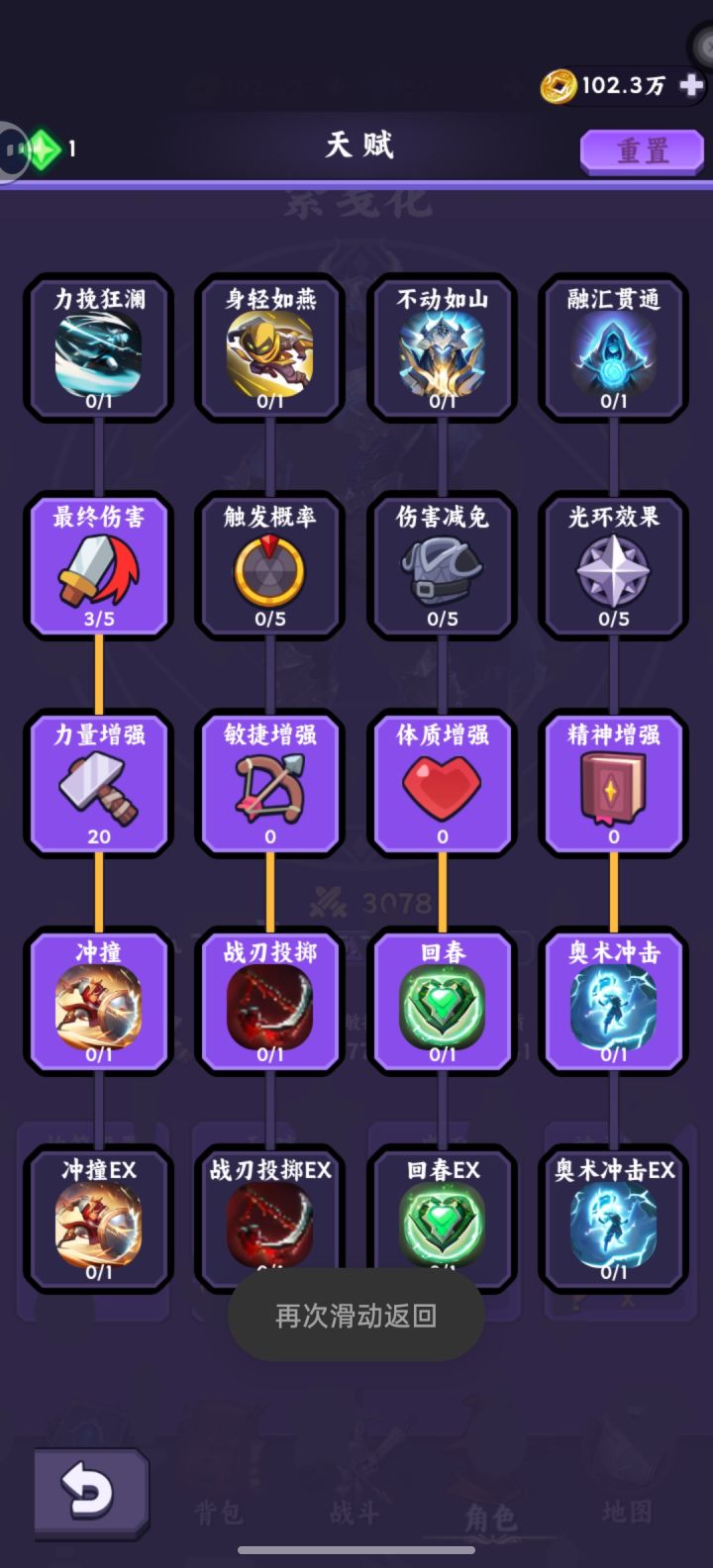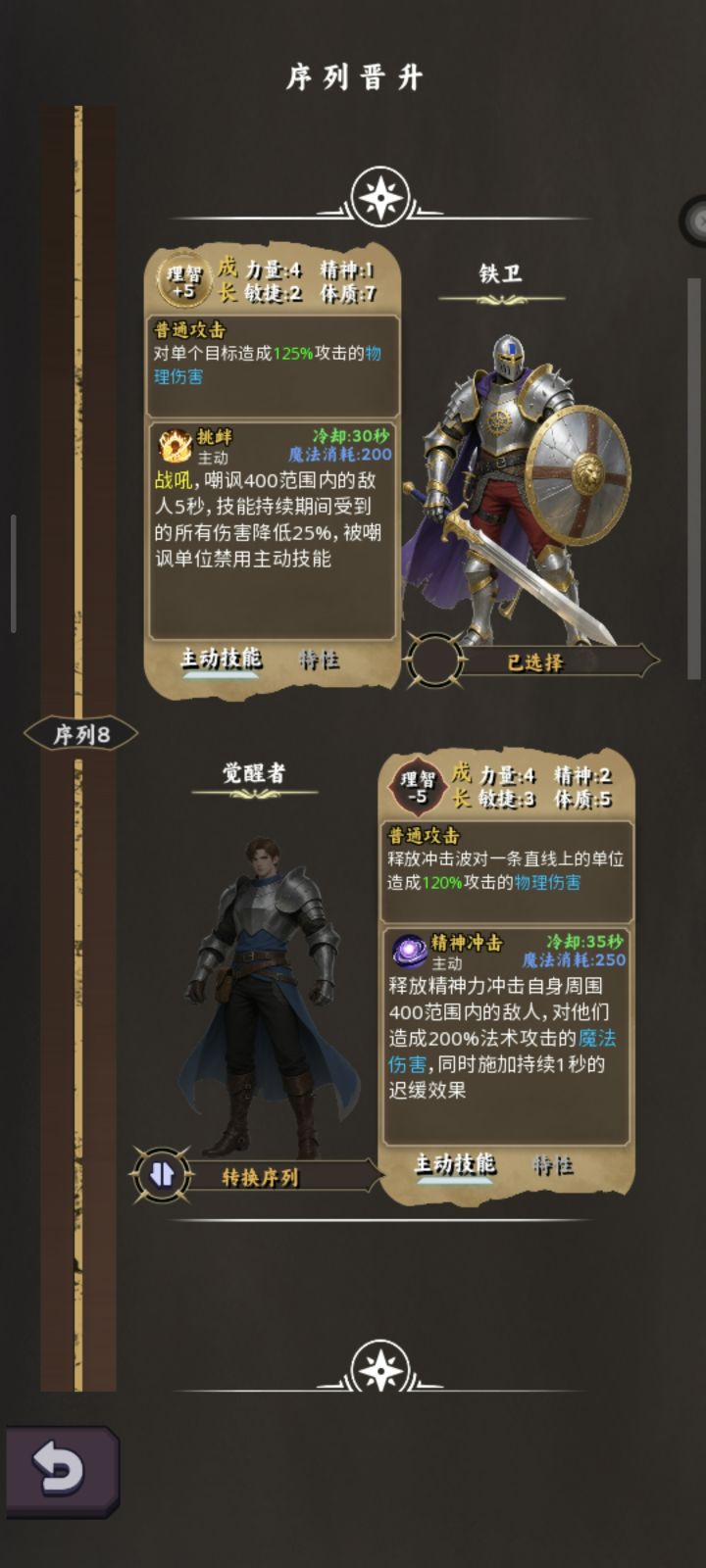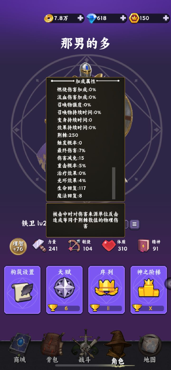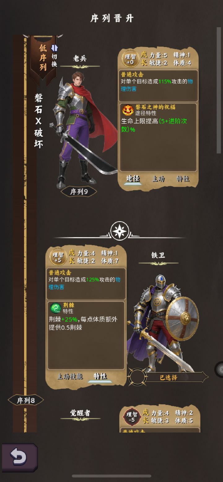 磐石✘破坏进游戏跟随引导完成任务,挂机到十级晋升序列8铁卫,虽然觉醒者普攻为一条直线两个单位,且十秒一次强普看似刷怪很强但由于前期攻速不够,难以提升足够得效率,选择铁卫被动反伤能更好应付多怪物场景。跟随主线任务,装备选择体质荆棘词条得装备,以及传奇词缀尖刺(能提升不少荆棘伤害)和传奇词缀物理伤害荆棘吃物理伤害的加成,传奇词缀20%体质也是不错的选择,模拟刷怪前提升最大战力(高荆棘)以及登神阶梯