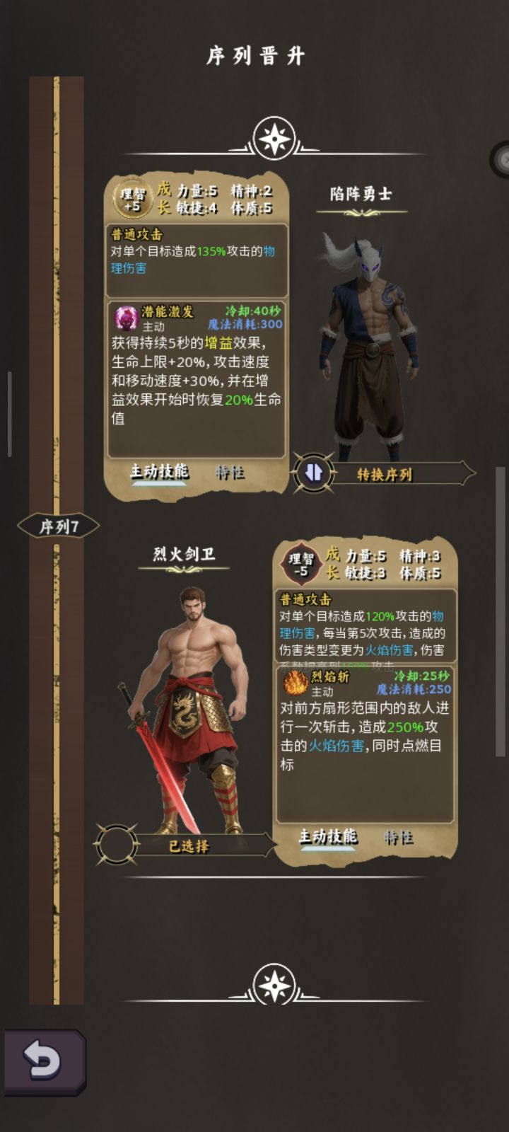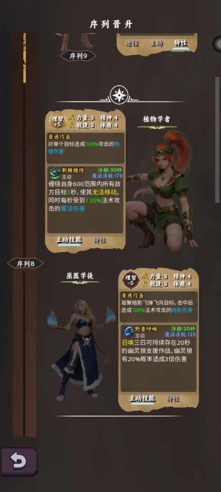 1、按引导很快就到10级,10级后在人物界面那里要升级序列,不然无法再升级,序列8如图选植物学者,多一个主动技能(很强的一个法系技能),因为下面那个狼杀不死人,别看植物学者他普工物理,技能法师,前期不用太挑装备,好发育,武器尽量选双攻那把刀,主拿物理属性的装备,有双攻的优先选。听劝祝福石先别用。注意:主线那个挂机模拟那里,这个杀怪的多少直接关系到你的升级快慢以及装备、强化石及材料的多少,所以第一