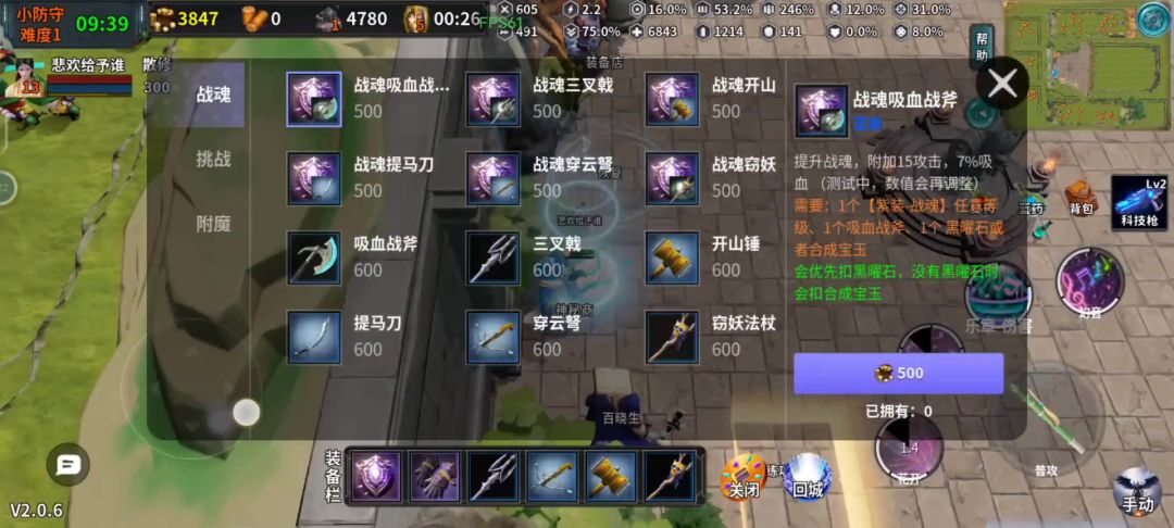 战魂一件非常全能的装备什么属性都能增加 但也因为他的全能所以比一般的红色武器还贵一点 一局最多可拥有6件战魂(同一名称不生效) 强化需求分别要的蓝色是(攻速,吸血,穿透,冷却,暴击率,暴击伤害)每次使用一个武器合合成石或者黑曜石强化一次,每次500金币(加上武器1100金币) 目前对局建议出装最多出两个或者一个战魂就够 可以考虑强化(攻速或者吸血)穿透,暴击率,暴击伤害,冷却 如果是需要多个战魂怕