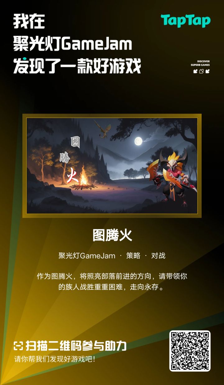 设想是来源小说,一簇火成为原始部落的图腾,受族人祭拜,通过族人的信仰收获图腾之力。图腾之力可以让族人变强,给族人纹刻上图腾纹使其成为图腾战士保卫部落,但维持图腾纹的力量也需更多族人提供信仰...图腾之力还有攻敌,治愈的功能,我将以建筑的方式展现出来。#聚光灯gamejam开发者日志