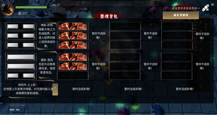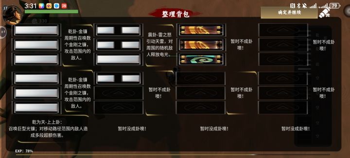 之前并没有玩过很多中国风的游戏,看宣传视频以为是最常见的三选一刷刷刷那一套,没想到这个游戏打磨得还不错这个游戏里阴阳、卦象什么的要素非常多,主要的操作是手动拼卦象,换一下顺序就会变成完全不同的技能这种玩法,应该是它跟一般的割草游戏相比创新的地方吧。因为本人比较无神论者,也没接触过周易之类的,一开始以为自己不适合这种风格,但是玩着玩着看游戏里的秘籍也稍稍学会了一些,这些算是国学吗?玩游戏竟然涨知识