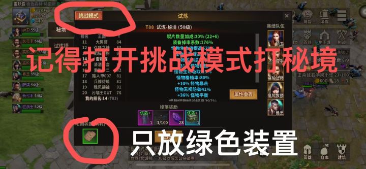 对萌新的友情提醒,内附兑换码。废话不多说,直接进入主题:1、首先,很多人都不知道绿色的地图装置该怎么用,在这里我可以给大家提一个使用建议,就是把绿色的全拿来打个人的秘境挑战,切记,只放绿色的,你会发现只要你有时间,可以爬到T80层以上,虽然前期收益不高,但是刷到30层以后你就会发现绝对是划算的。友情提醒,刷的时候记得开启左上角的挑战模式,这样才能不影响你的野外收益。2、自从更新出重生徽章以后