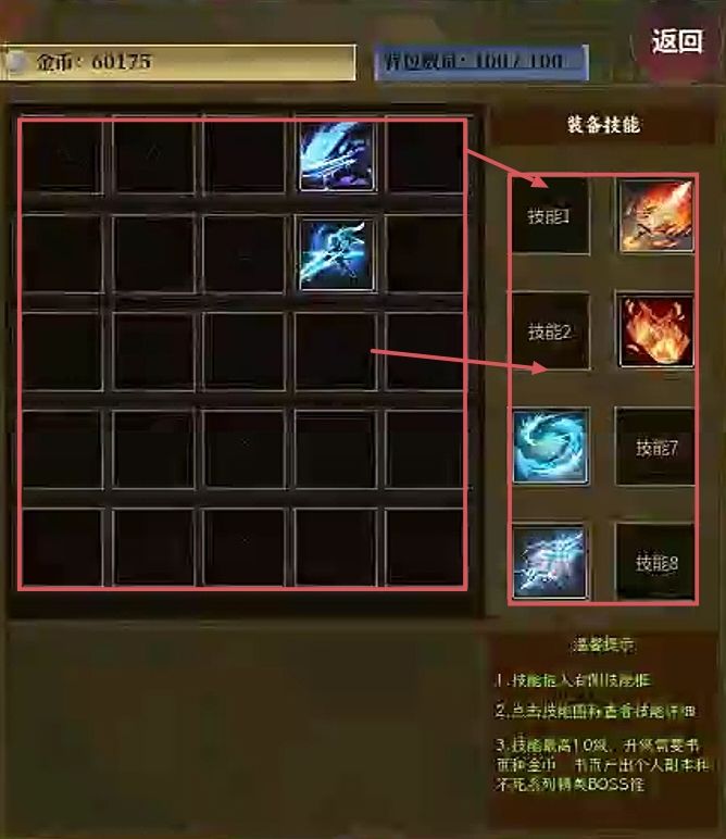 1.开局先加群,群里有新手礼包! 2.打开新手礼包3,打开背包把技能都学了,然后在背包技能栏里装配技能,看图!4.带上装备出门砍🐔,无等级之说,已经是最高等级!这游戏就是砍怪获取装备,装备看属性,品质无所谓!好的品质也就基础属性高一点, 白色装备也出好的属性词条!5.等到有100多攻击攻击几十防御的时候,就可以往地图上方走传送到中洲城,不会的去的看地图,到了中洲城先去安全区一下,不然回城就