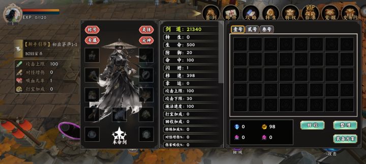 一、个人游戏评价 可以玩的小众刷子游戏,装备全靠打充钱没地方花,入门门槛稍高98元 游戏亮点,目前没有任何逼氪行为无礼包,无定制,无隐藏消费个人评价在星火属于低消游戏,装备能交易98花时间就能打通,纯白嫖不能交易难度较大不建议玩二、开局 进入游戏领取福利后直接开始刷图vip需要打怪解锁获取的神器宝箱先不要开能开出转生等级加1的装备个人建议4转左右开箱子然后回收界面