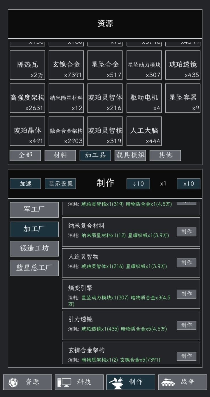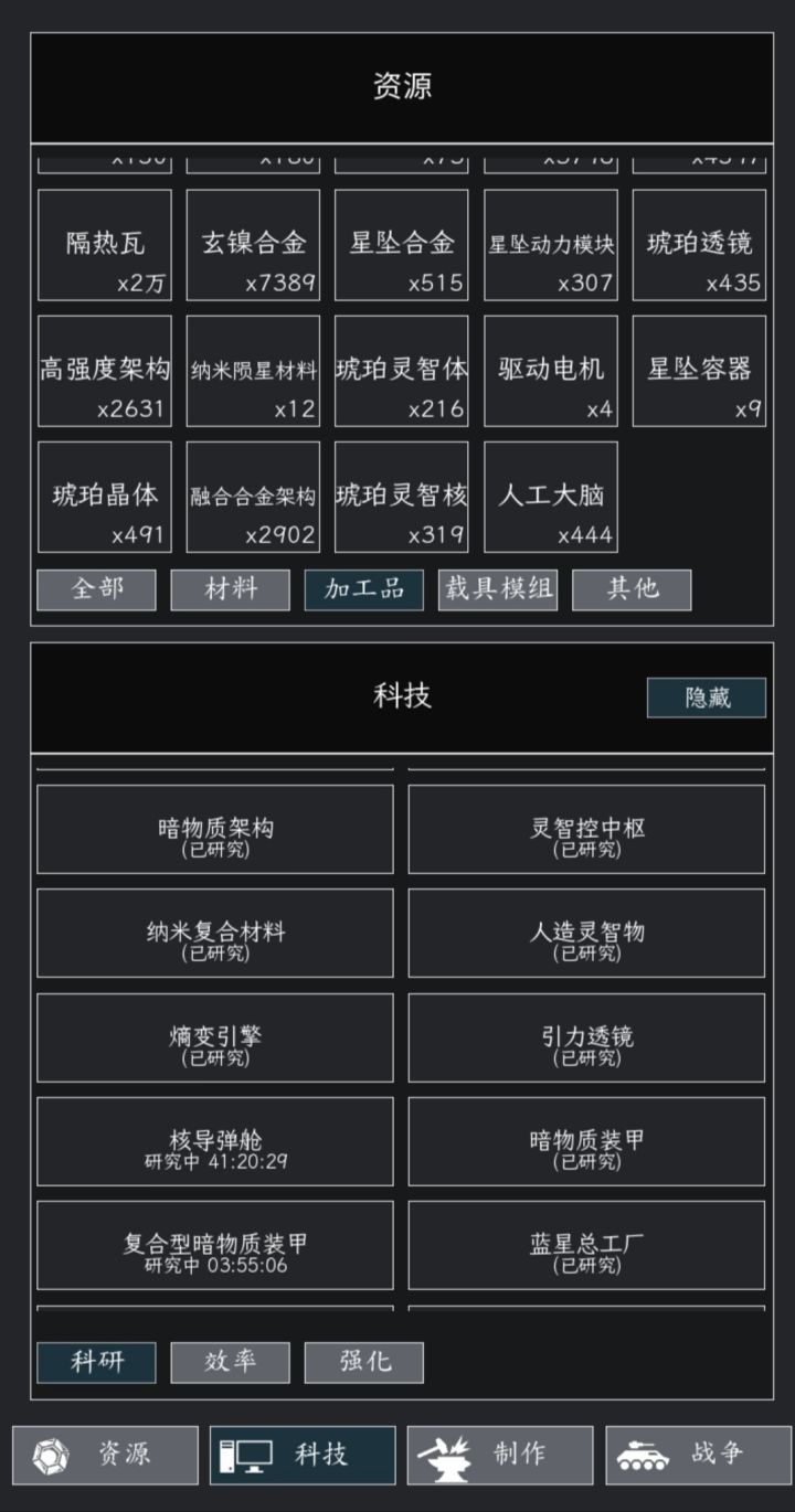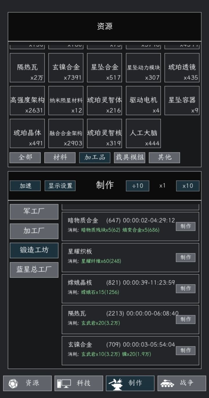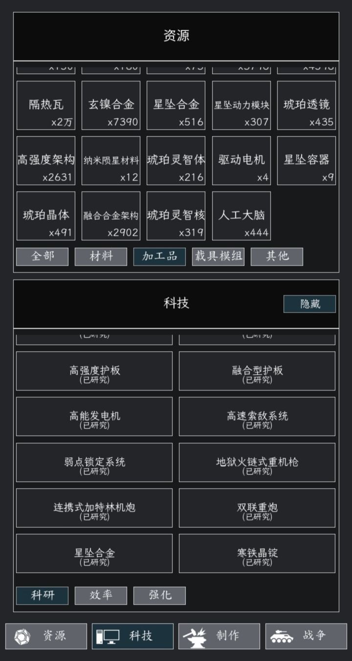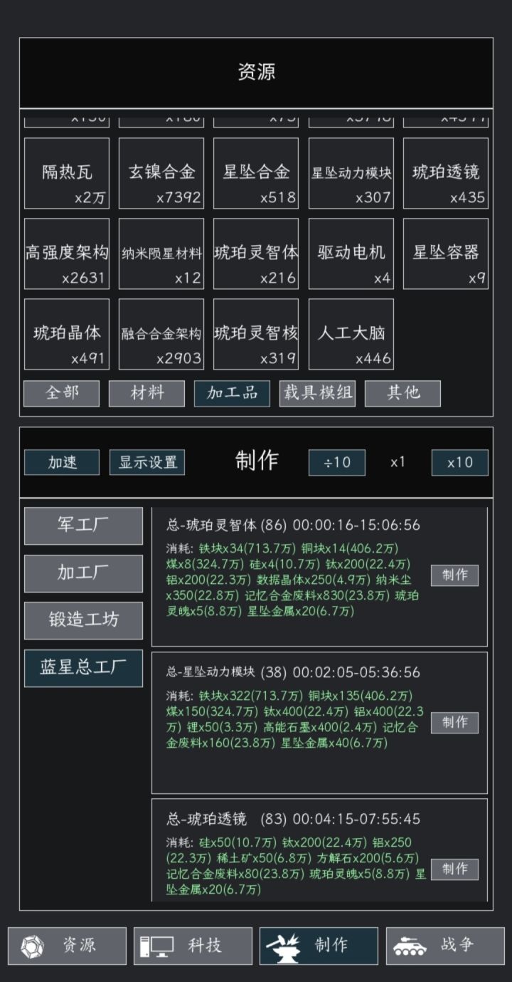先5级步枪,空间1(2小时), 7级步枪(1小时25分钟),5级钢板(5级合金板也可以),做发动机做6级机枪,解锁科技优先级,机炮6级要3小时。要机炮24小时不停,高板不能做,就先做加强型护板。护甲先不做自适应,先留着做小队,重机枪也先做小队,手枪看机会做,7万多铜也不多,但是铜线圈先分了做铁板和手枪,因为铁板时间长,步枪时间短,(手 枪M加步枪M用时6天,铁板用时6.8天)所以分解铜线圈先做手枪