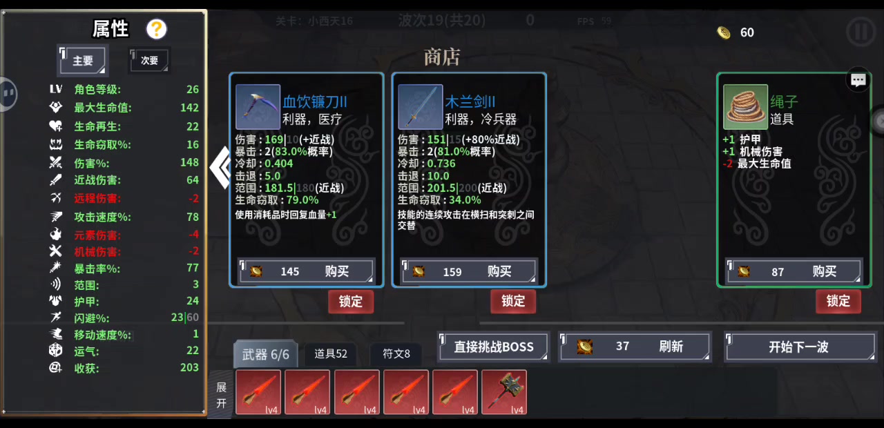 玩法攻略: 1 武器搭配 出门带剪刀,刷噬魂剑,或者带噬魂剑,刷简单,噬魂剑多拿几把,杀死敌人增加伤害%属性的,中期刷到镰刀也要拿,后期换其他近战武器,比如战锤,雷公锤等高输出武器 2 玩法主要是挨打,血少的时候就躲一躲恢复一下 3 属性 前期多拿生命再生,保证生存,多拿近战伤害,也多拿点伤害%尽量把伤害从负拉到正。 3 遇到道具 炼丹炉拿两个,关键时刻跑过去吃药回血 4 护甲和生命窃取也要拿一些