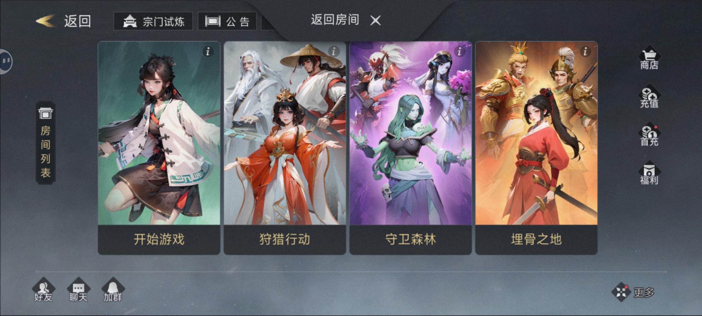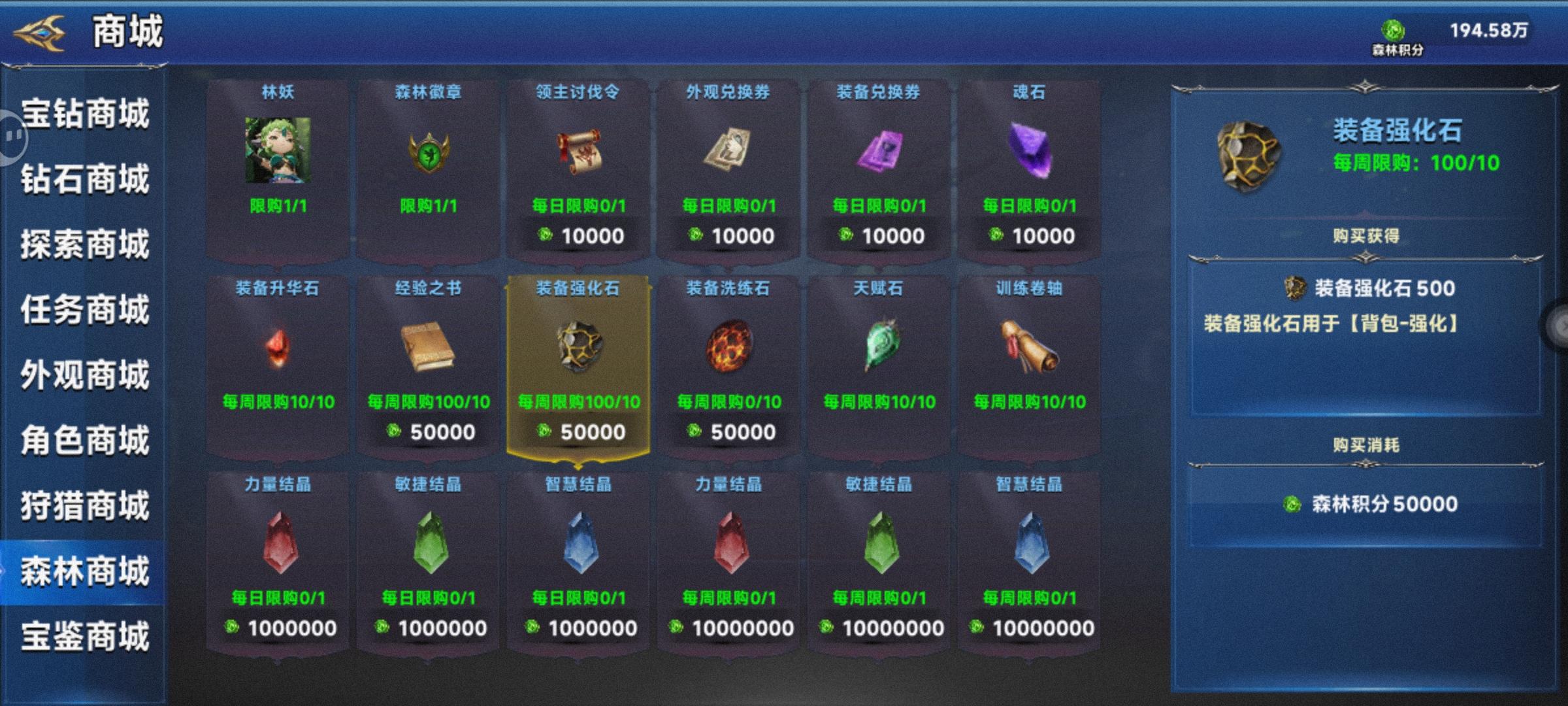 本文仅供0氪党第一,尽量加群,群里有兑换码和有大佬刷积分会喊人,可以蹭一下,能用好长时间,实在不想加也没问题,看封面左侧有个房间,看到里边有狩猎或者森林的房间,直接进,大部分是没有问题的,右边三个就是积分了,分别是狩猎,森林,经验第二,点击图一开始游戏后会进入图二界面,找到商城,森林,兑换第一排第一及第二(只要第一个也可以),此时准备工作已完成(本部前提是有进入过森林多人本且积分最少100w)