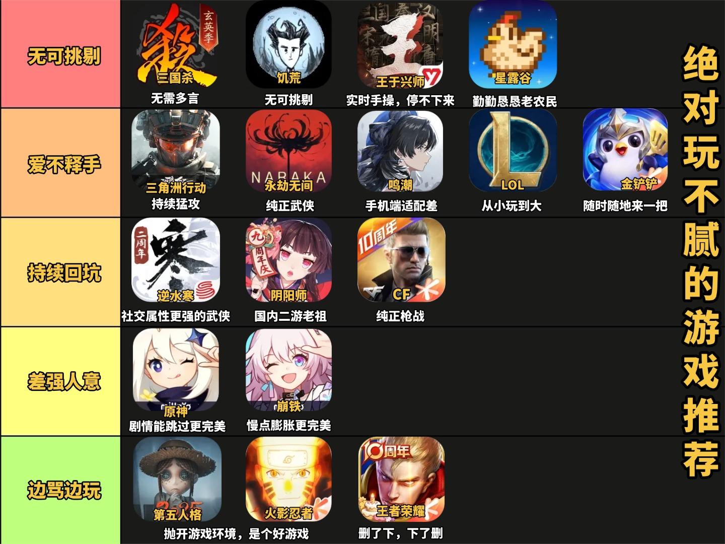 推荐些玩不腻的游戏,有经典也有新品。有无可挑剔的良品也有些让人边骂还想边玩的游戏。第一排这些绝对是杀时间利器,第二排这些也很不错就是容易红温第三排也是能让人持续回坑的佳作原神和崩铁就有些差强人意,如果能优化优化绝对更好最后这三个真是让人边骂还想边玩。