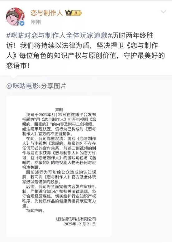 01叠纸起诉咪咕,涉嫌使用《恋与制作人》内容宣传电视剧近期,上海市知识产权法院对《恋与制作人》诉咪咕案作出终审判决,认定“咪咕电影”在商业宣传中非法使用游戏原创元素构成了不正当竞争。随后,咪咕电影正式发布道歉声明,针对其侵权行为向《恋与制作人》官方及全体玩家诚恳致歉。2023年5月,咪咕在微博平台发布电视剧《温暖的,甜蜜的》宣传视频时,在未经官方许可的情况下,擅自使用了《恋与制作人》原创的