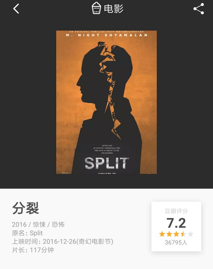 这是一部今年年初刚上的电影,主打剧情与惊悚。在看电影简介的时候,当看到24个人格的时候我第一时间想起了一部叫《二十四个比利》的长篇小说,这是一部改编自真实案件的小说,向人们详尽的反应了真正的人格分裂病人。我满怀期待的看了这部电影,却满怀失望的看完,看豆瓣评分挺高的时候我以为这会是一次较为成功致敬,结果却发现是一部完完全全的商业片。首先说说电影的叙事,《分裂》这部电影采用了非常传统的好莱坞式叙事,