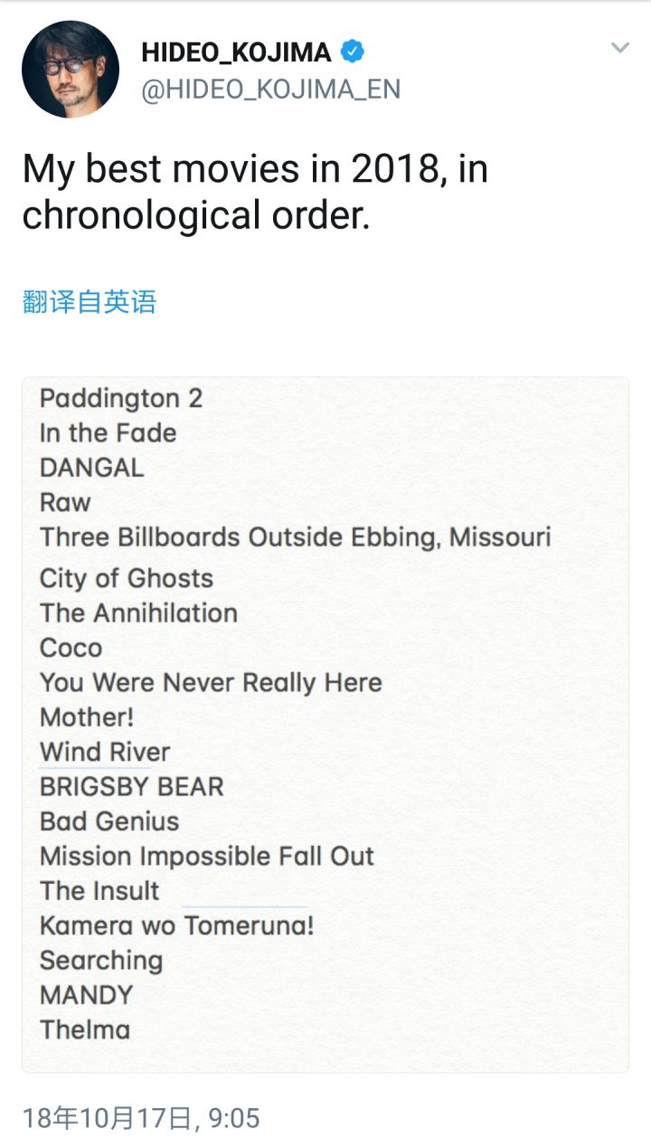 小岛秀夫的2018观影清单