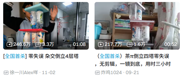 到底是从什么时候开始,我的首页全是“全国首杀”?事情是这样……前段时间,我在B站刷到了一个标题是“全国首杀”的视频,开始以为是什么高燃热血的游戏挑战,结果点开一看发现是最近重新火起来的“倒立水瓶大赛”。没有离奇的思路,只有脚踏实地的旋转、倒立;没有华丽的操作,只有平平无奇的脉动、茶π,听上去一切都很质朴……可只有亲眼看见高塔从零起步,一层层扶摇直上;看着水瓶里剩下的那点液体,把白炽灯的光折
