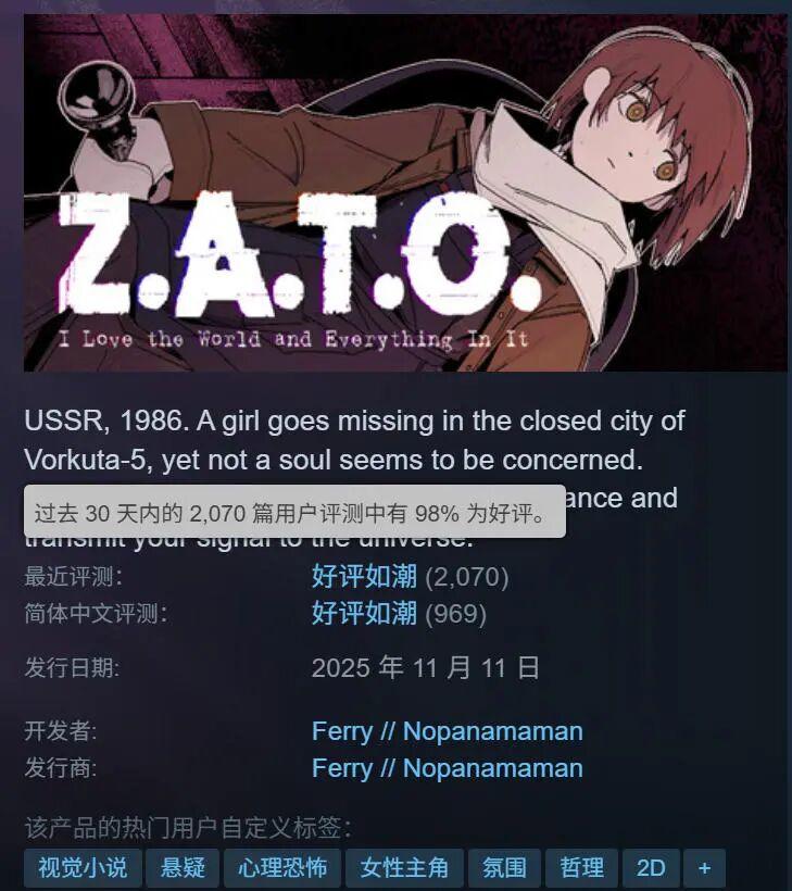 1969年,一本叫《站在世界中心呼唤爱的野兽》的科幻小说集出版,今天小说的热度早已不再,但其标题却被用在EVA等作品中,致使它出圈。如今,这个有点被滥用的短语,就非常适合拿给2025年末的一款免费游戏。游戏叫《Z.A.T.O. // 我爱这个世界以及其中的一切》,如果你关注这类独立作品,那我估计你已经刷到过它了。游戏在一些平台热度不低,尤其是它最近有了很靠谱的民间汉化,你可以在Steam评论区找