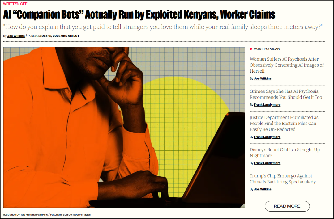 前段时间,一个主要做新兴技术新闻的网站Futurism,刊载了一篇很有意思的报道。标题是《员工声称:AI“陪伴机器人”实际上由被剥削的肯尼亚人运作》。为了方便,我们就暂时称呼报道的主角为小M吧。小M自述他从航天院校毕业后,迟迟没能找到工作。为了养家糊口,只能接下澳大利亚公司“New Media Services”提供的文字聊天运营员岗位。听起来像是客服,或者是内容审核。但当小M真正进入工作后才