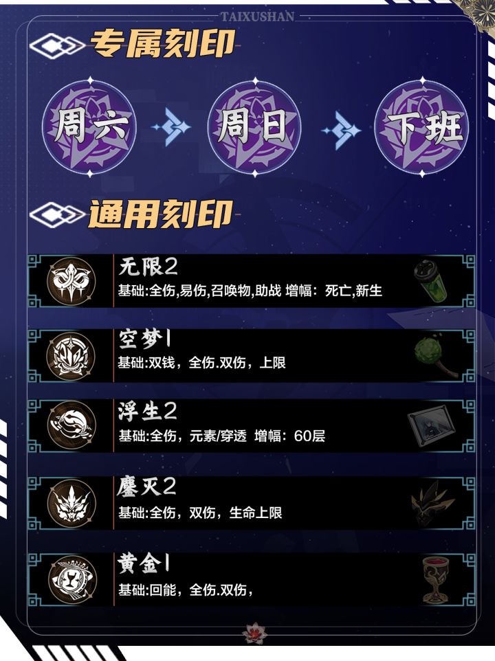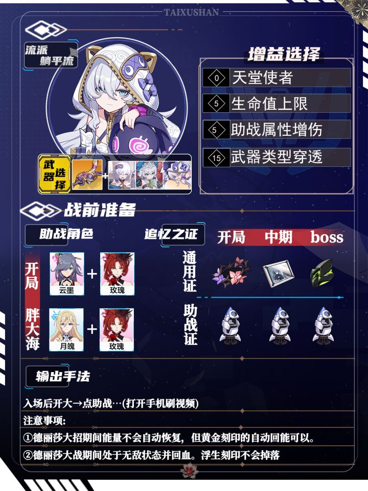 ★本期因子:天堂使者(0)生命值上限(5)助战属性增伤(5)武器类型穿透(15)★专属刻印:周六-周日-下班☆注意事项:①德丽莎大招期间能量不会自动恢复,但黄金刻印的自动回能可以。②德丽莎大战期间处于无敌状态关回血。浮生刻印不会掉落★输出手法:入场后开大→点助战…(打开手机刷视频)★通用刻印:无限2基础:全伤,易伤,召唤物,助战增幅:死亡,新生,浮生2基础:全伤,元