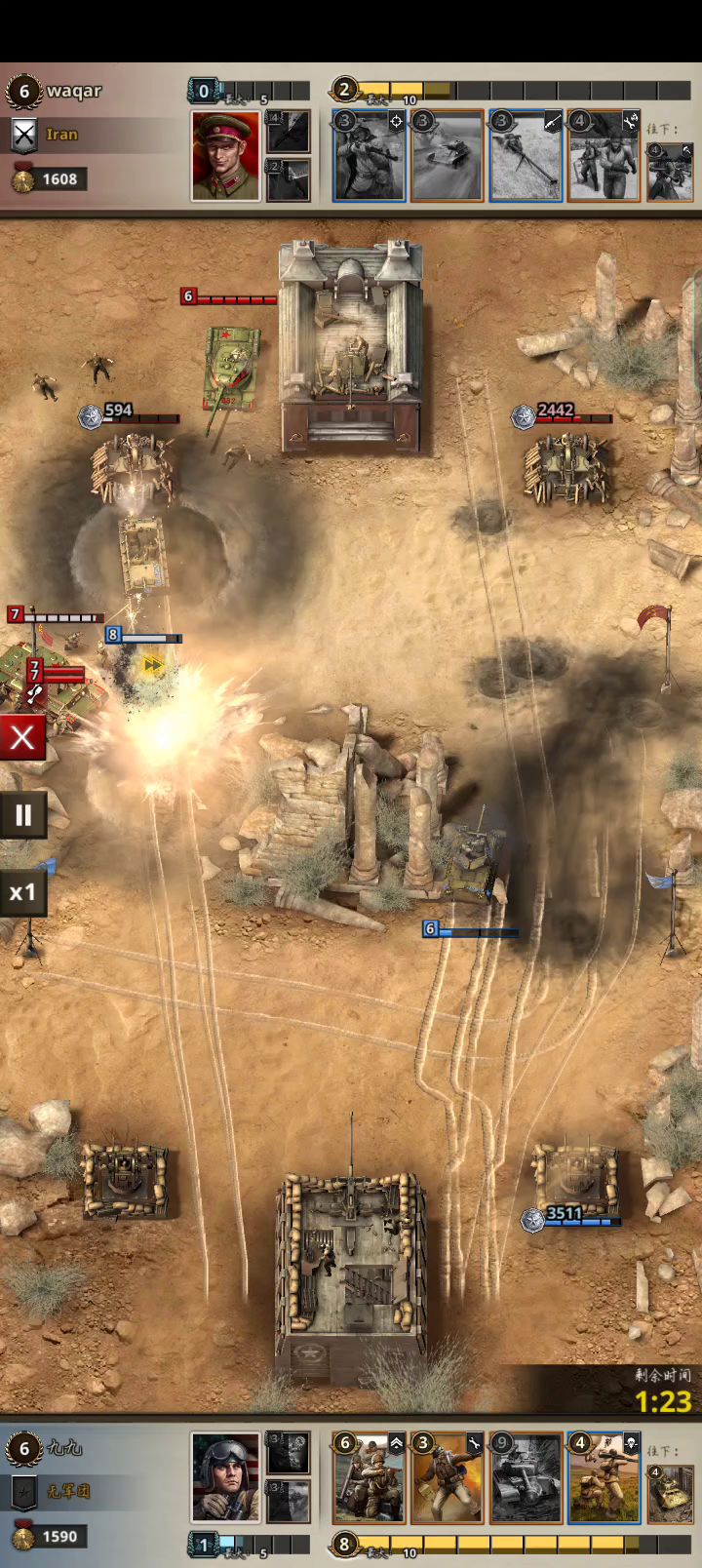 优势:费用低,万金油,反打也可以,等压1、2级也可以打 劣势:挡不住钢铁洪流和西德人海、迫击炮 战术:打坦克:近卫队和双卫队(卡1、卡3)一起,因为总费11,所以双卫队先放后面,然后等一费再把近卫队从边上放,或者枪榴弹、反坦克版,T-70收场 打人:游击队、刑罚、或者装甲车(卡5) 战绩: