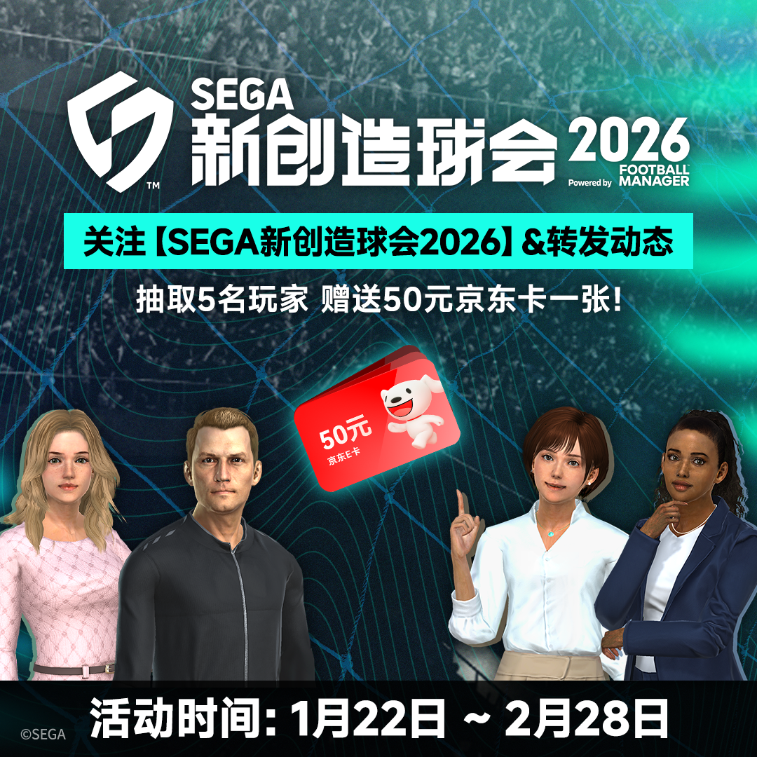 ⚽🎉《新创造球会2026》上线福利活动来啦!👉 关注 + 转发本动态,我们将抽取5人获得50元京东卡一张不管你是老球迷,还是从来没玩过足球游戏,只要你想当足球主教练,都欢迎你来SEGA《新创造球会2026》试试!在SEGA《新创造球会 2026》中,你将亲手打造属于你的独一无二的球队。从地方小队起步,通过球员培养、战术制定、转会管理,你的每一个决策将会影响球队的命运。《 新创造球会#SEGA