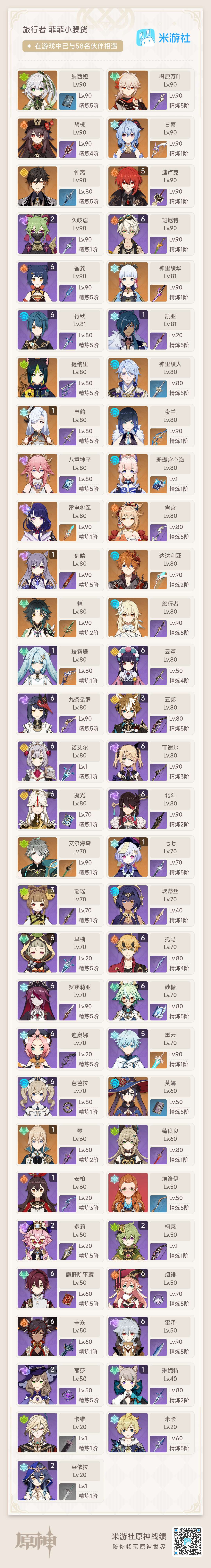 打着玩的 配置如下(裸面板): 菲林斯:精一专武,71/229.1,精通120,攻击2406,穹镜套 伊涅芙:精五峡湾长歌,千岩套,81.7/184.5,精通40,攻击2228,零命 满命爱诺,精五活动大剑,纺月触发者 满命砂糖,精五讨龙风套,精通643