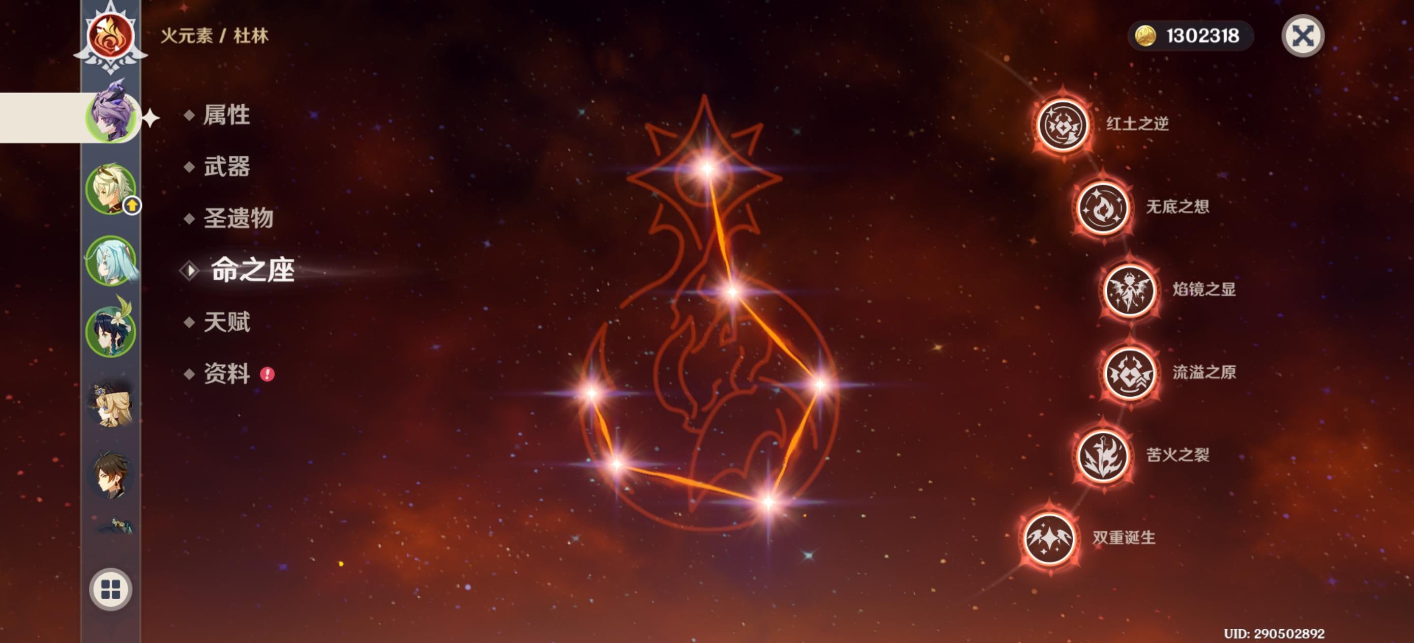 我之前队伍一直是6杜0温,温迪是风套,6班6珐,很爽,但是我将杜林放到了0命克洛林德和0命瓦蕾莎,刻意不用夏沃蕾,6杜的实际提升只能让这两c的伤害翻一倍。这时候我才发现原来是温迪加了风套减了火抗,白杜火后台伤害打了套循环一半的伤害,这两人左脚踩右脚,伤害才可观的。雷的提升一倍对于一个6命7个金的成本是完全不值得的,如果是6命丝柯克,一个群星寂灭伤害爆炸。 说实话,我后悔了。