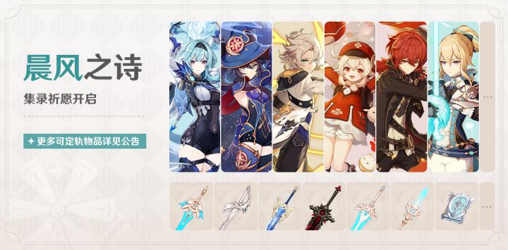 活动期间,旅行者可以在集录祈愿中获得更多角色与武器,组建强大的队伍!〓祈愿介绍〓●活动期间,旅行者可以在本期所有5星物品中自主选择并定轨1个5星角色或1个5星武器作为本期「晨风之诗」祈愿出现概率提升的5星物品!●活动期间,限定5星角色「浪沫的旋舞·优菈(冰)」「白垩之子·阿贝多(岩)」「逃跑的太阳·可莉(火)」,限定5星武器「双手剑·松籁响起之时」「弓·终末嗟叹之诗」,限定4星武器「单手剑·
