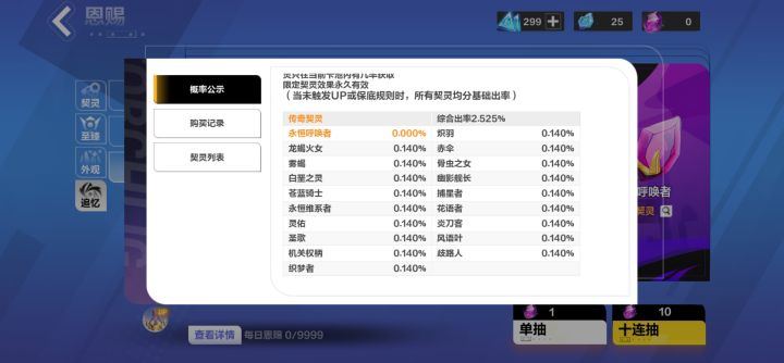 别急,阿宽和策划仔细确认了,概率公示这里读取的是一个过往的已经废弃的同名恩赐活动的概率,所以显示永恒呼唤者的出现概率为0,且其他契灵的出现概率也不对,稍后我们将进行公示修正。现在实际上永恒呼唤者出现概率为0.923%,概率公示那里仅为显示错误。
