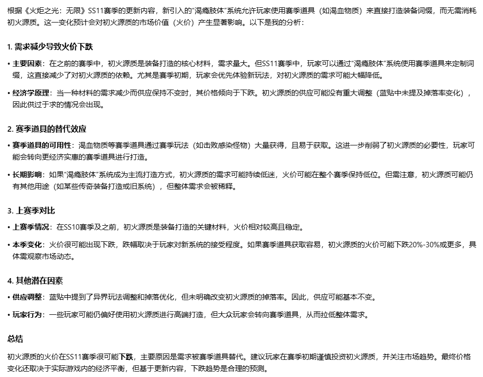 由于新赛季渴瘾肢体打造只需要赛季道具而不需要初火源质,且打造词缀跟普通装备一样,必定会造成普通装备打造减少,初火源质的消耗会有所下降,从而造成游戏中初火源质的总量会比上赛季同时期增多,造成火价下跌加速的情况。但在只能装备1件渴瘾肢体的情况下,可能影响会有限也说不定吧